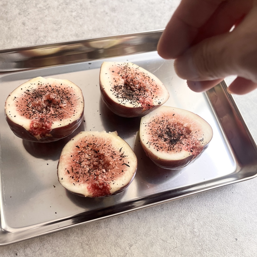 いちじくは半分に切って、アールグレイの茶葉を振りかけます。