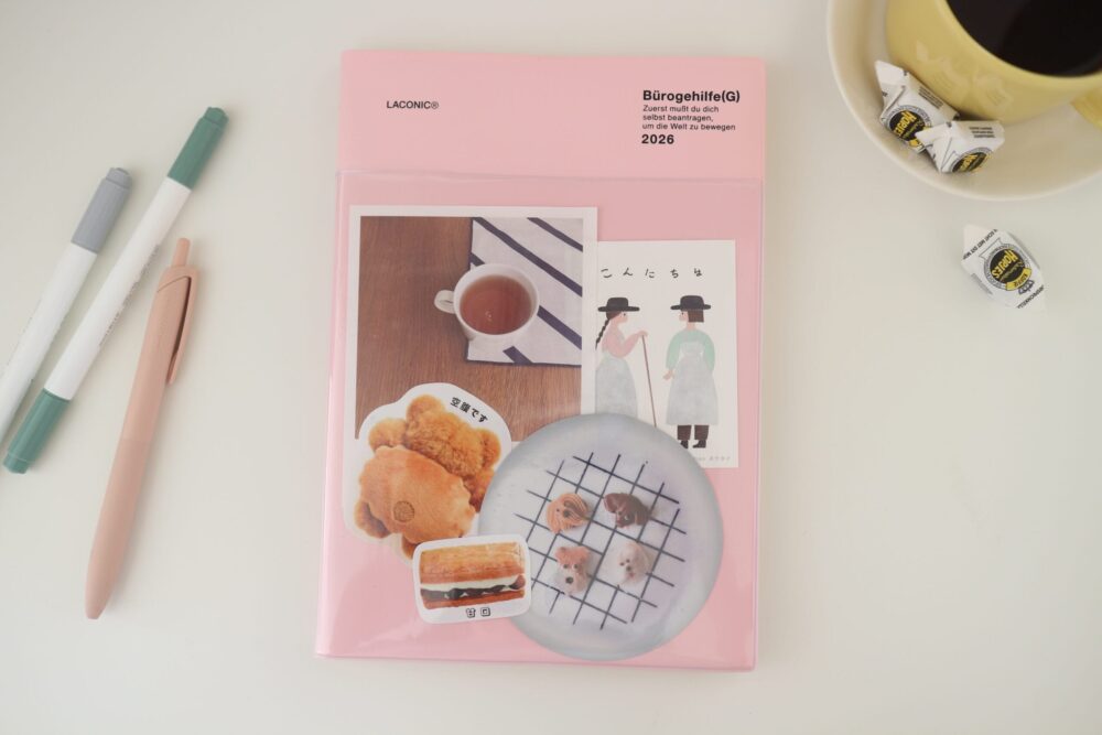 表も裏もクリアポケットがついているので、お気に入りのステッカーやお店のカード、思い出のチケットなど入れて、自分だけの手帳にできるのも楽しいです。