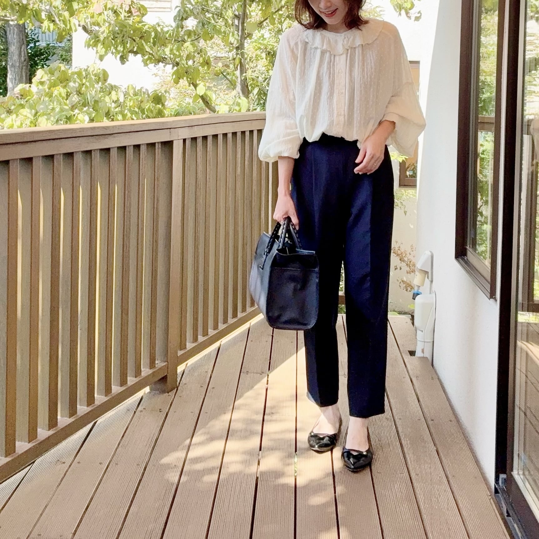 先日ブログでもご紹介した石上美津江さんコラボのブラウス、テーパードパンツ、パンプスでまとめています。↓ブラウスのご紹介ブログはこちら
