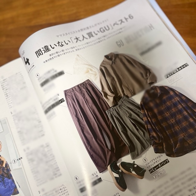 ママスタイリストの水野利香さんがセレクトしたGUアイテムと、そのアイテムを使った水野さん流コーデが紹介されいていました。どれもこれも大人が着ても違和感のないアイテムで中で、最も気になったのは左のブラウンのタックパンツ。