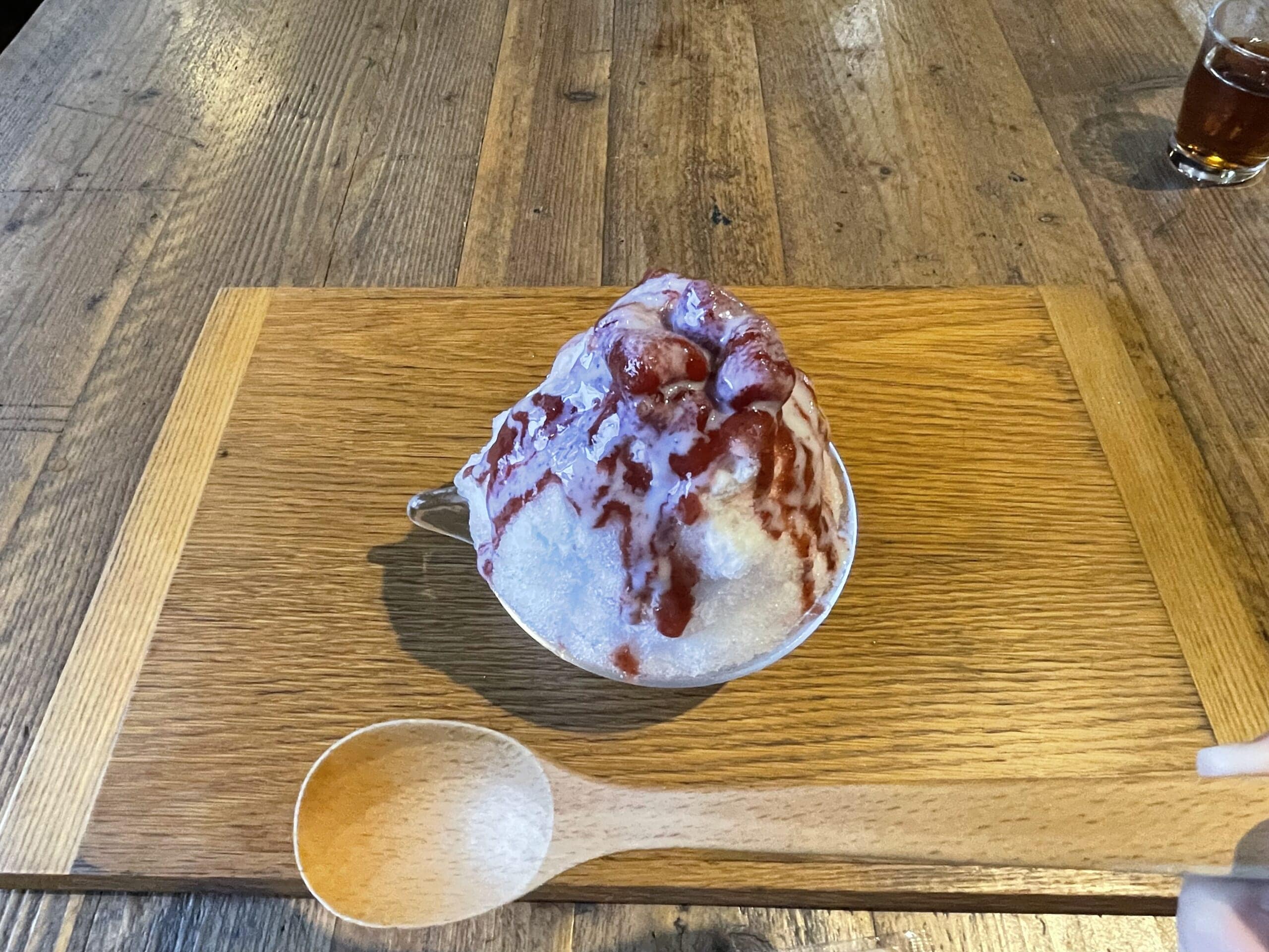 この日は娘と2人で訪れました。娘オーダーの、苺ミルクのかき氷。フワフワの氷の上に、JIKE STUDIO自家製の苺シロップがたっぷりかかっています…!