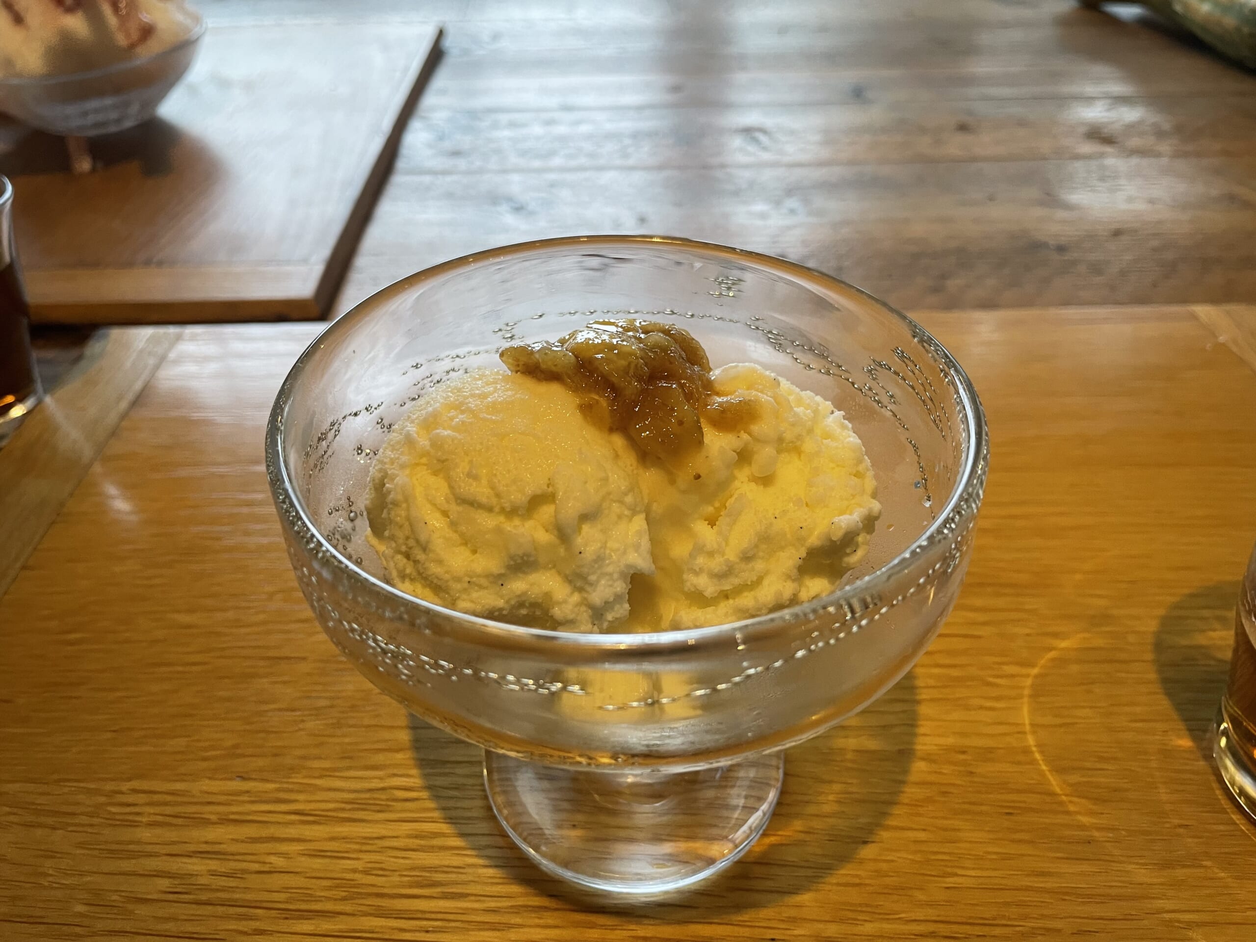 ↓こちらは、私オーダーの塩ミルクジェラート、いちじくソース添え。柔らかな口どけのミルクジェラートに、ほんのり塩がきいていて、シンプルながら奥行きのある味わいに。そしてこの日は、珍しくいちじくソースがかかっていました!旬のいちじくを煮詰めたフルーティーなソースです。JIKE FARMで採れたいちじくを使われているのだと思われます…!