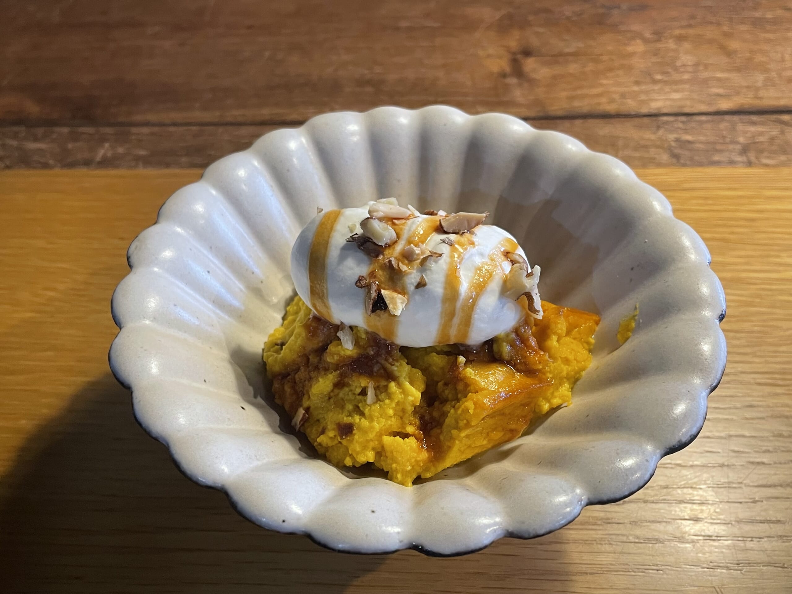 カラメルのほろ苦さがギュッと全体を引き締めていて、優しい甘さとなめらかなホイップクリームがかぼちゃプリンの濃厚さと好相性!トッピングされたクラッシュナッツが食感のアクセントになっていて楽しい一皿です。