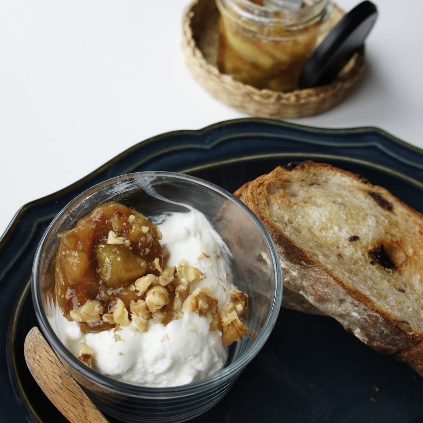ちょびっとしかできなかったコンフィチュールをグリークヨーグルトに乗せて、クラッシュしたくるみと混ぜて・・・