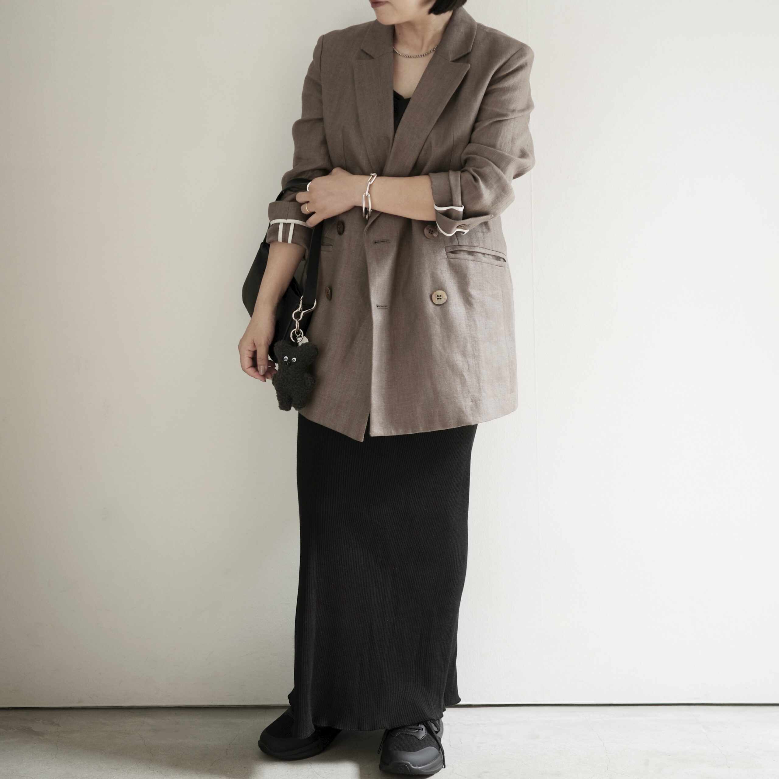 ジャケット×タイトスカートがかっちりした雰囲気なので、足元はスニーカーで抜けをつくってみました。