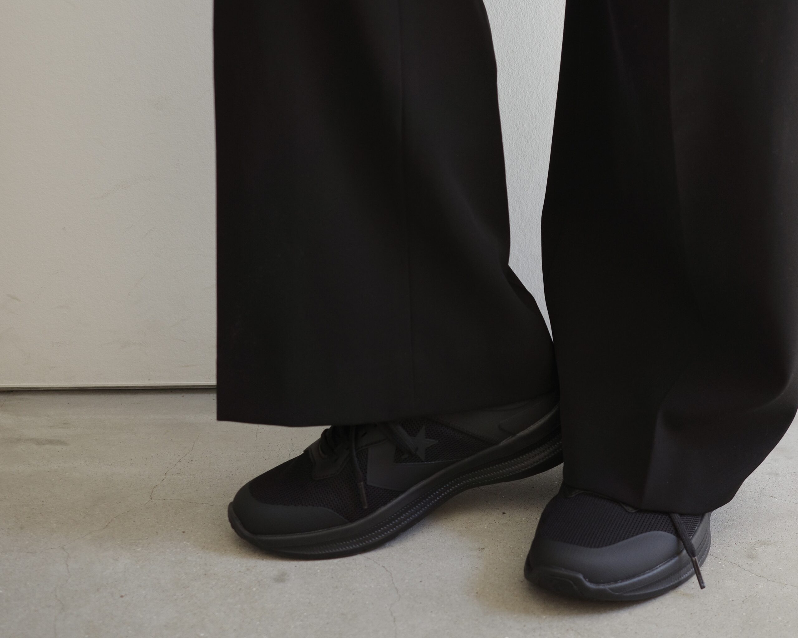 スニーカーは目立たせるより、断然なじませたい派。センタープレス入りの黒のスラックスにも、同色のスニーカーがぴったりです◎