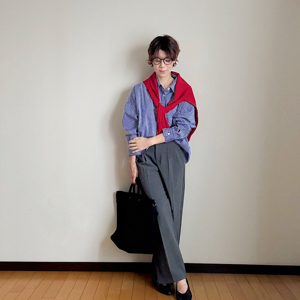 グレーのタック入りパンツと合わせて、きちんとさを出したコーデ。仕事スタイルにも!?