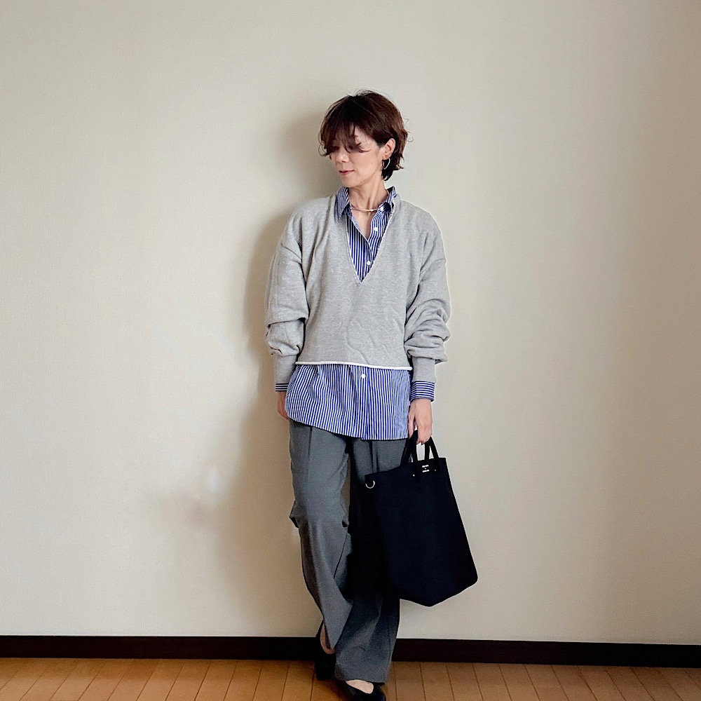 Vネックスウェットと合わせて、足元を黒のフラットパンプスにすることで、仕事スタイルとしていいかなというコーデ。