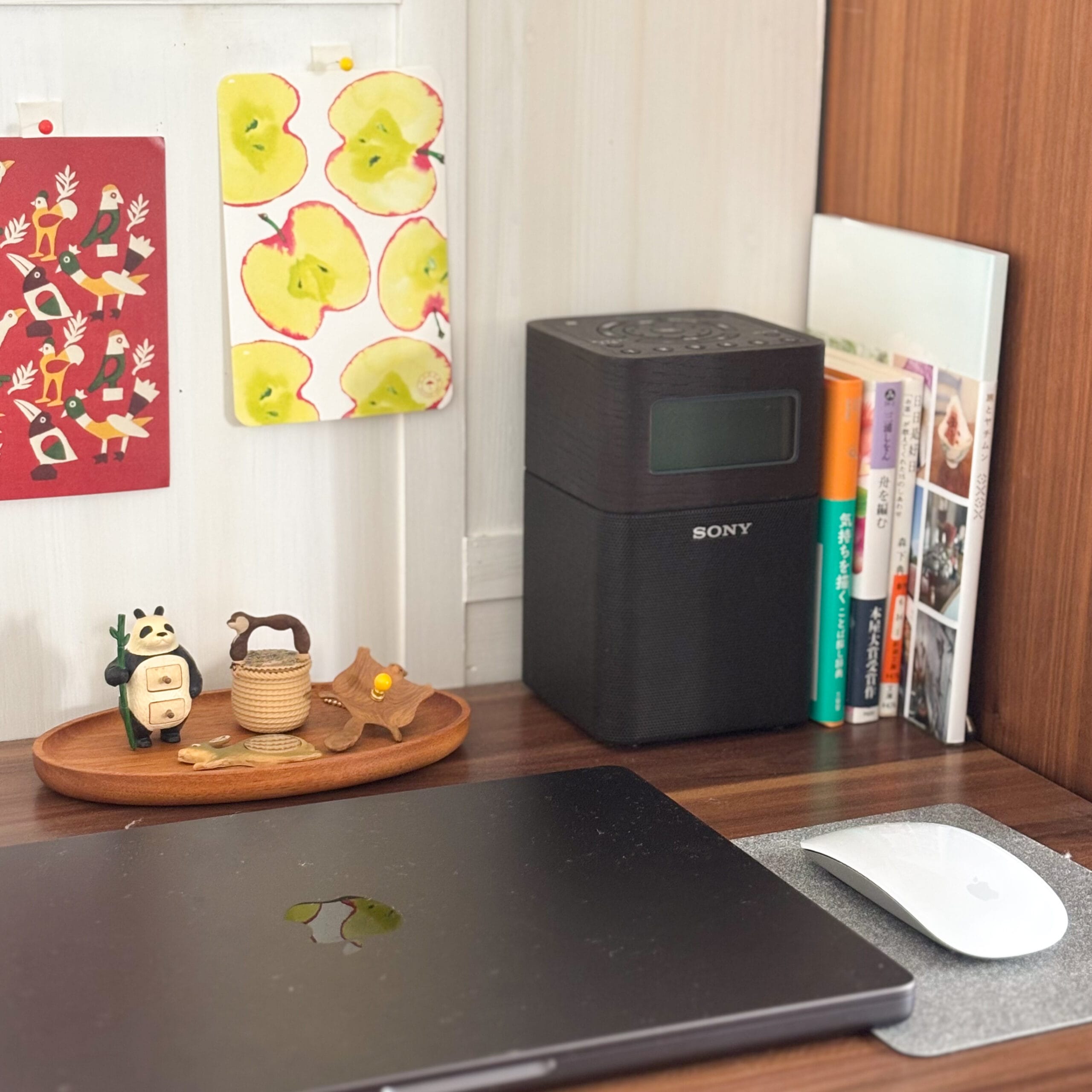 このかわいいミニチュアマスコットをどうやって愛でようか考えて、PCデスクに飾ることにしました。木製のトレーに置いてあげたら相性抜群!