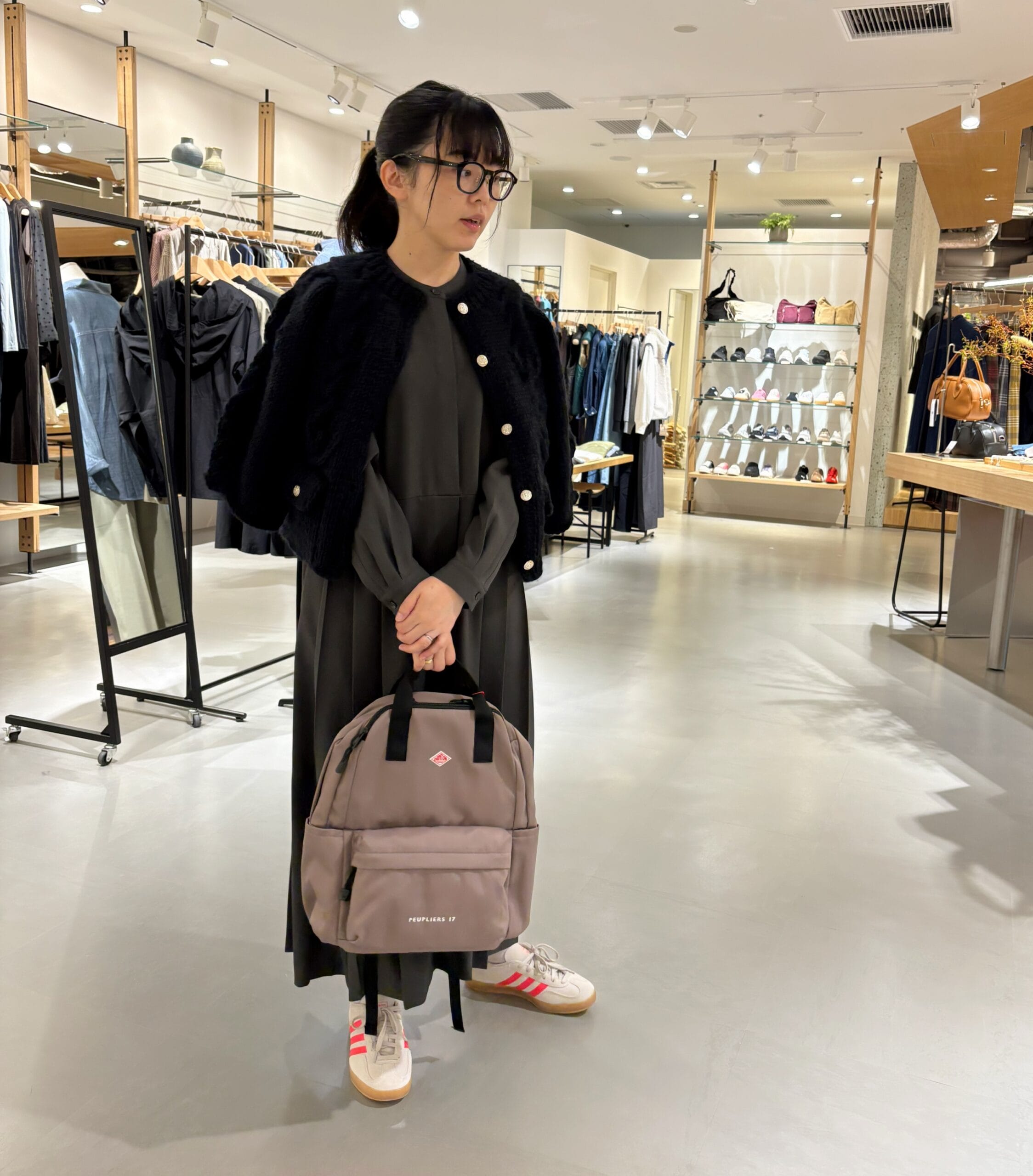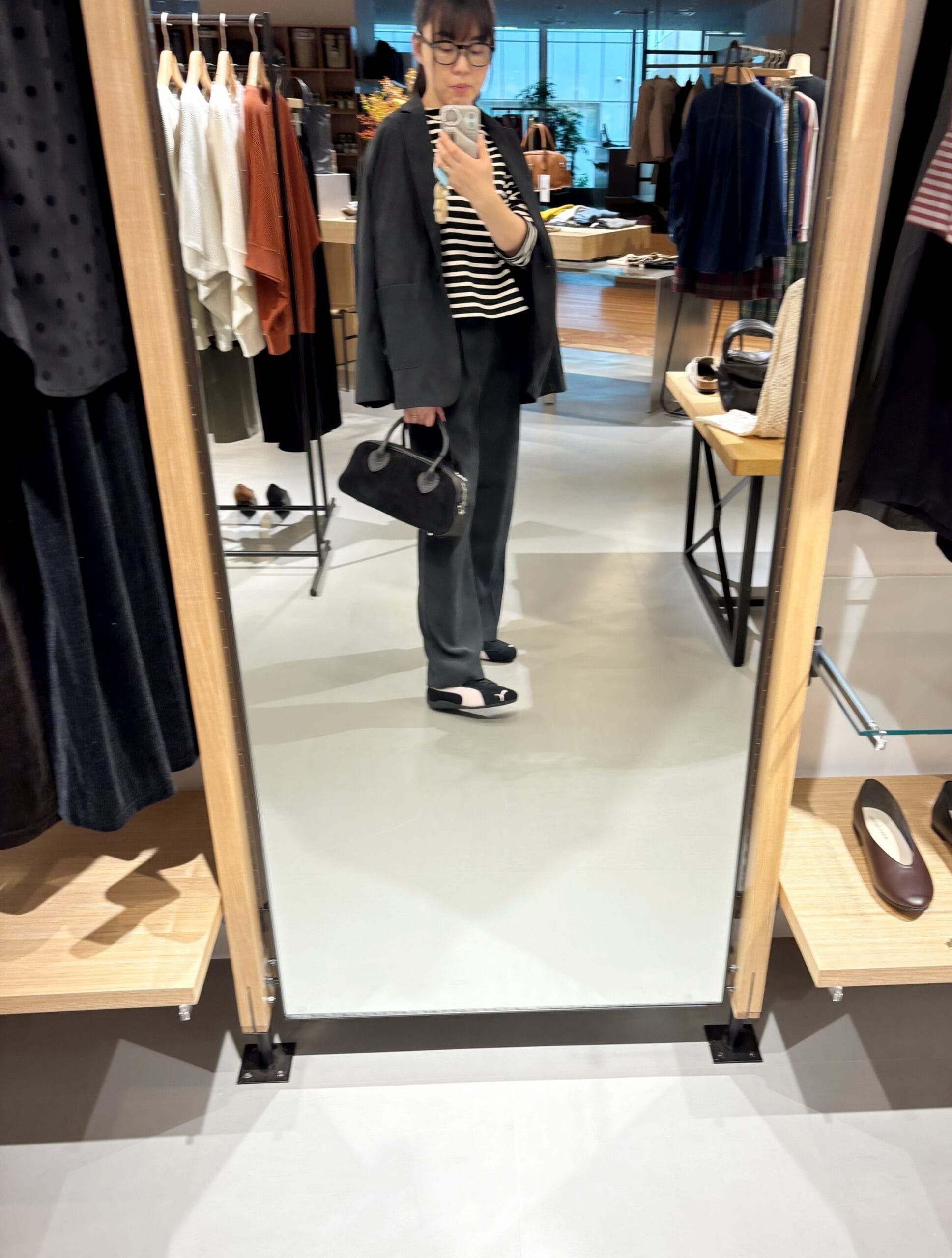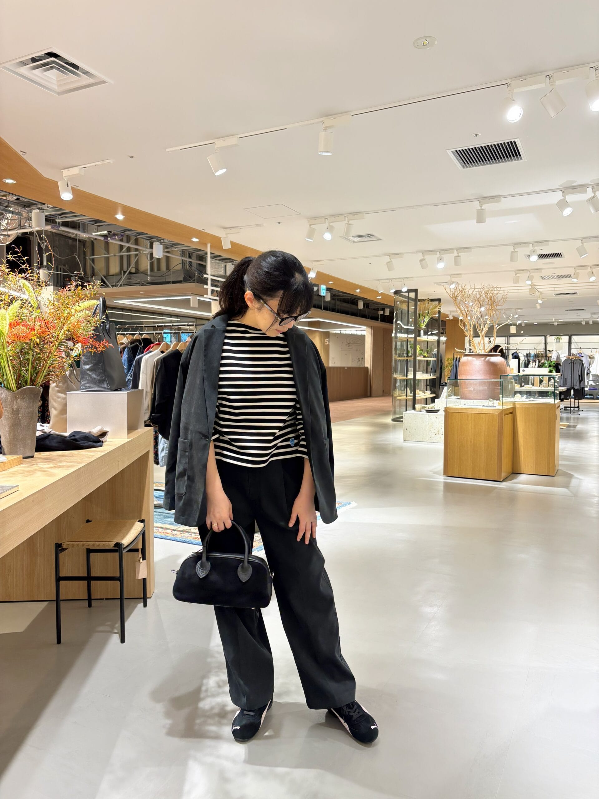 合わせたスニーカーはPUMA SPEEDCAT OG。淡いピンクとブラックのスエード生地で大人にも楽しめるカラー。娘たちにおねだりされているスピードキャットを試着させてもらってその人気ぶりに納得◎とっても軽くてスタイリッシュでPUMAデビューを前向きに検討!!