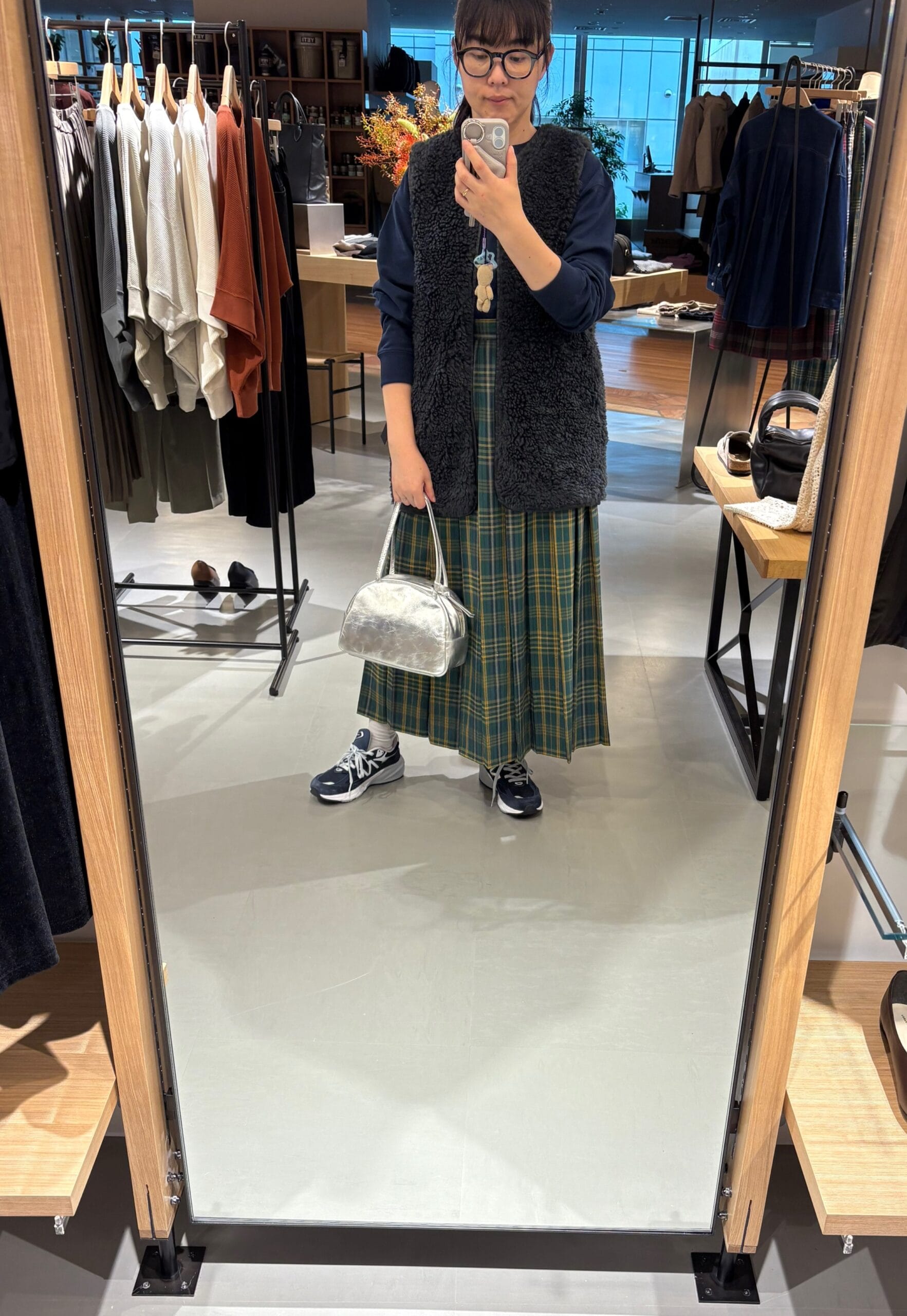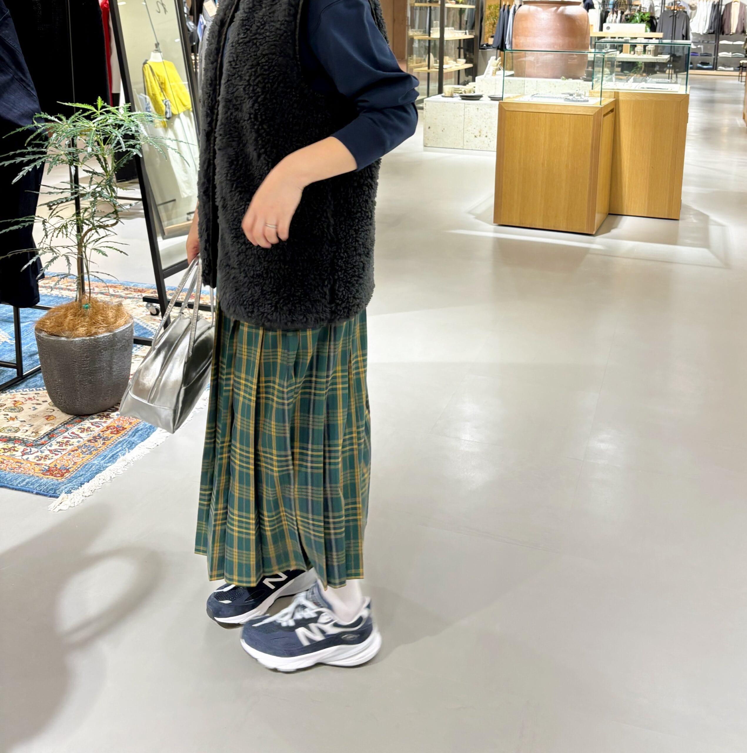 メインとして一番に手に取ったのは、URBAN RESEARCH DOORSで大人気のチェックプリーツスカートの一部店舗限定色【GREEN×YELLOW】。エモさを感じるチェックカラーと女性らしいプリーツで秋冬のスタイリングがグッと華やかに!