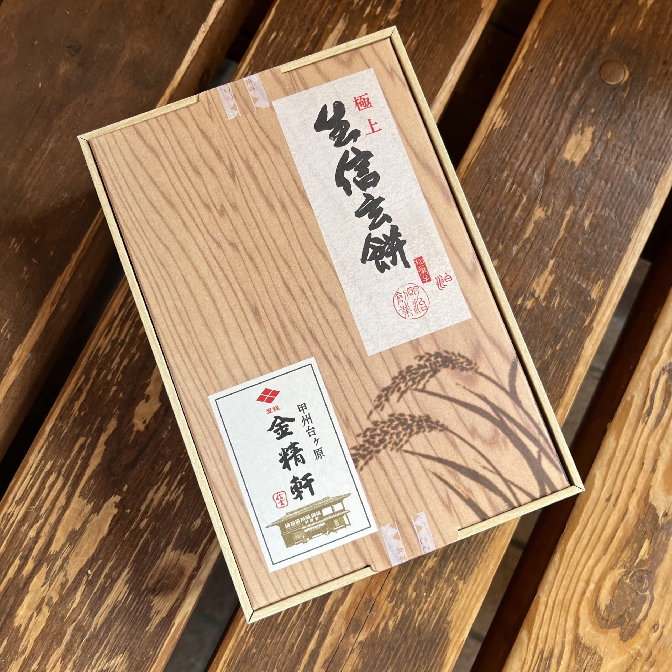 お水は白州の名水南アルプス甲斐駒ヶ岳の伏流水が使われていて、その豊かな水で育った地元のブランド米、「梨北米」だけを使用して作られている金精軒の「極上生信玄餅」。