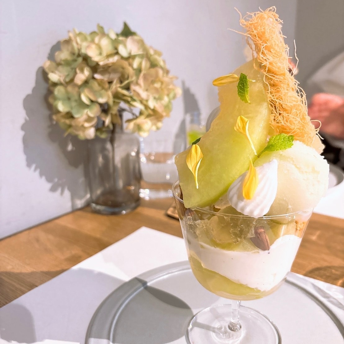 一番上に乗っている糸状のお菓子はカダイフという小麦粉で作られたもの。バニラムースやバターサブレ、別海牛乳ミルクアイス、富良野産ころたんメロン、メロンソルベなど北海道らしい内容。こちらもクリーミーで美味しかった♡