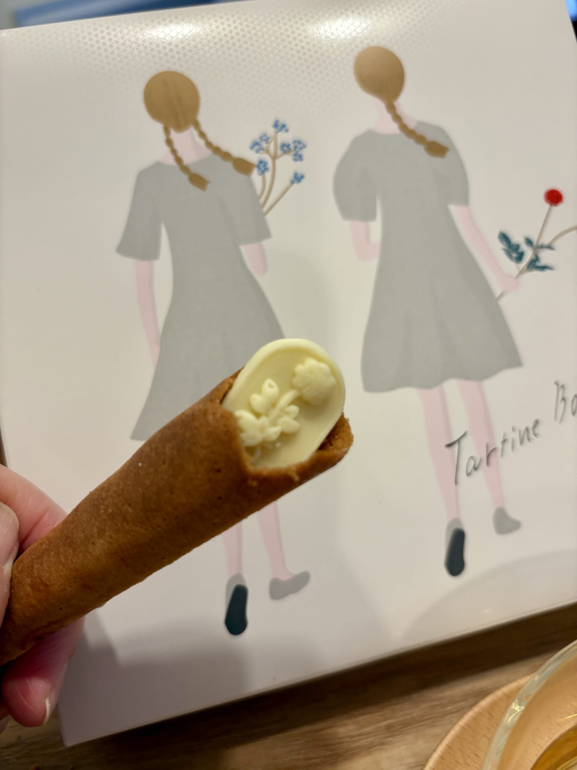 くるっと巻いたラングドシャの中にはお花のホワイトチョコ!中にもホワイトチョコのクリームが入っていて、アーモンドのアクセントも。