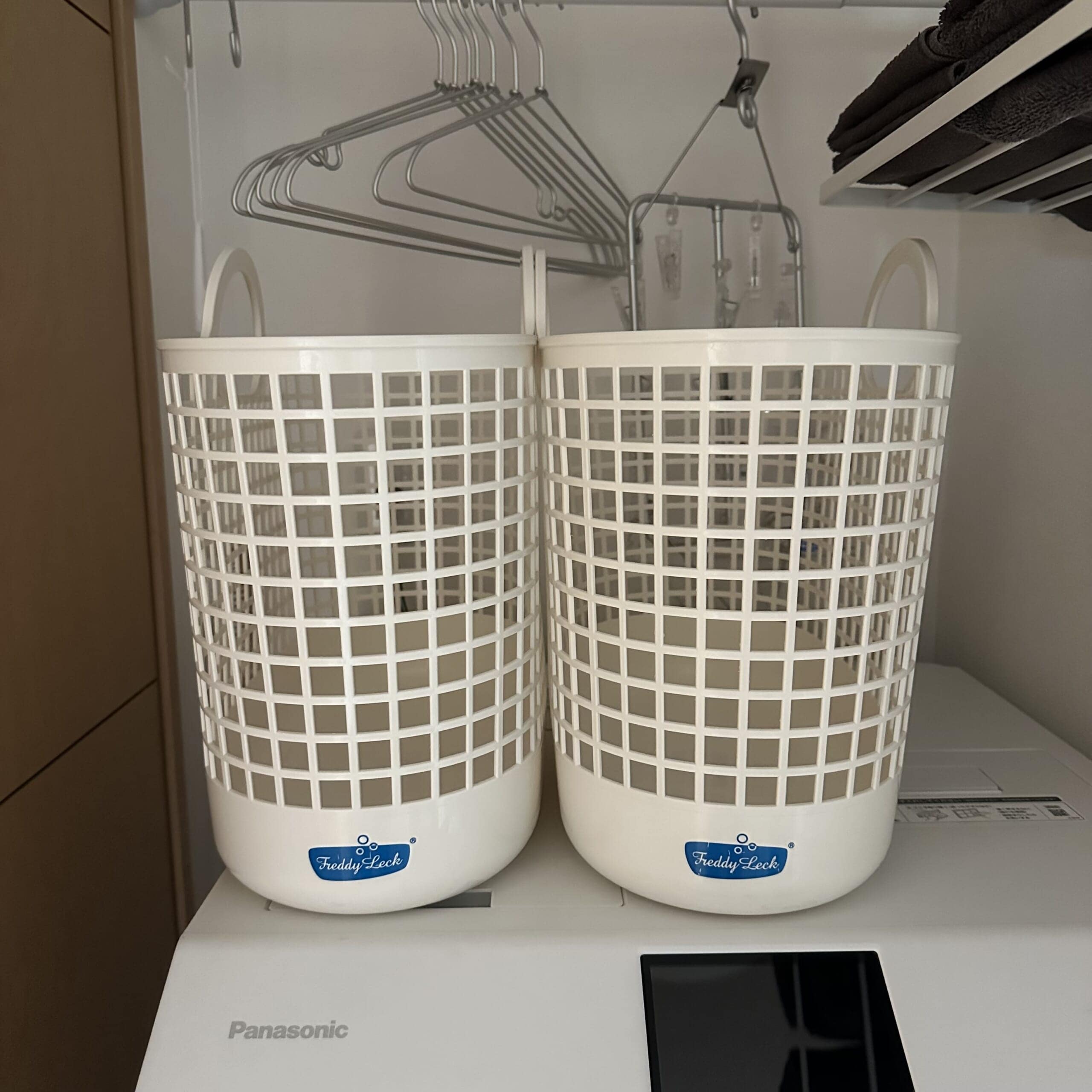 洗濯→乾燥までOKなものはそのまま洗濯機へ、手干しが良いものは左のバスケットへ、洗剤が異なるおしゃれ着洗いなどは右へ…とそれぞれが仕分けるように。