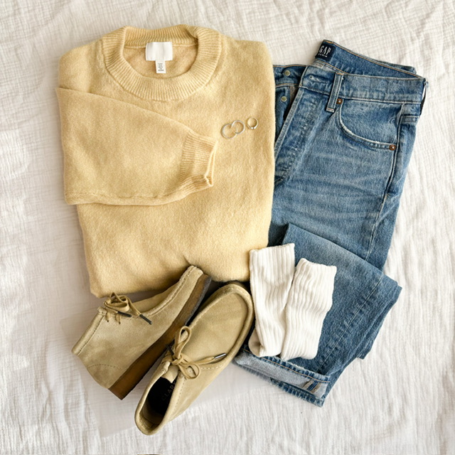 定番のデニムもニットをライトイエローに変えるだけで雰囲気が変わる~◎