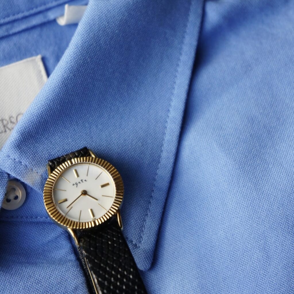 自分が持っているアイテムは、ゴールドが多めなので、この華奢な腕時計は重宝中です。文字盤を囲むゴールドの縁がかわいい♡