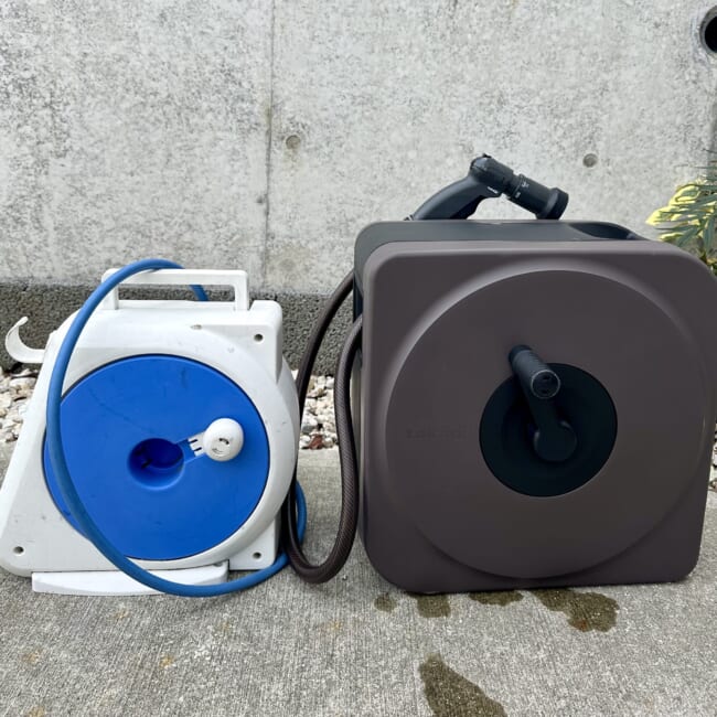 写真は、破損して使えなくなってしまったホースリールと新しく買い替えたホースリール。粗大ごみなのか、はたまた燃やすゴミとして出せる物なのか・・捨て方がわからなくて(調べるのが面倒で)放置していましたが、これを機に手放せてスッキリ!