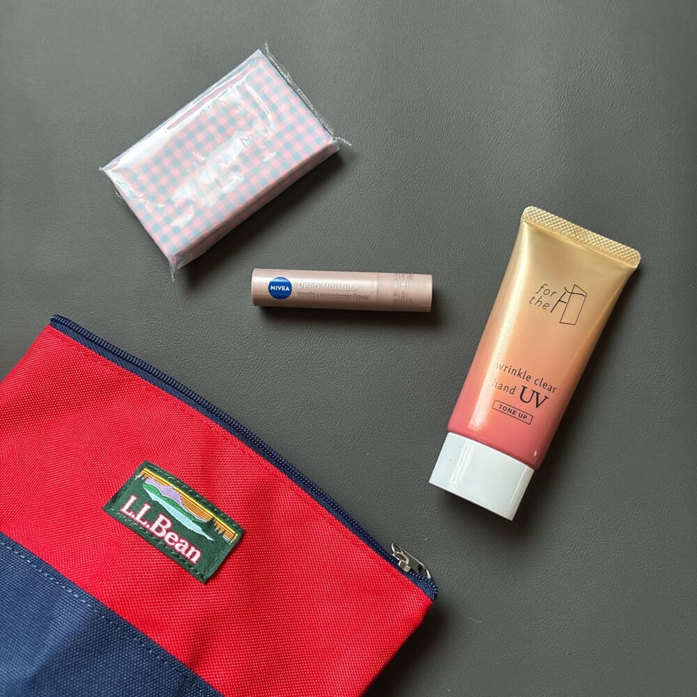 顔と首と腕に日焼け止め、手にはハンドクリーム、唇にリップ。