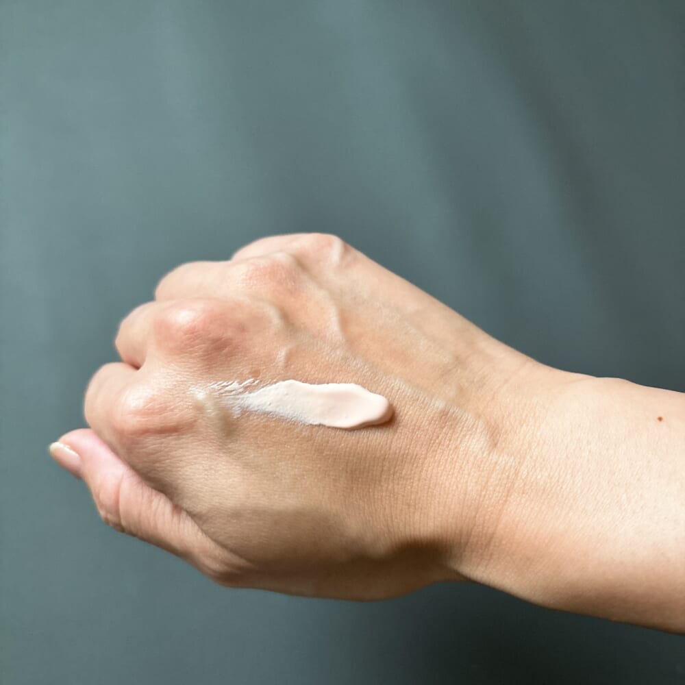 塗るとワントーン明るくなって、肌がきれいに見えるぞ。両手で違いを見せたかったけど、家に誰もいなくて撮影できませんでした 涙