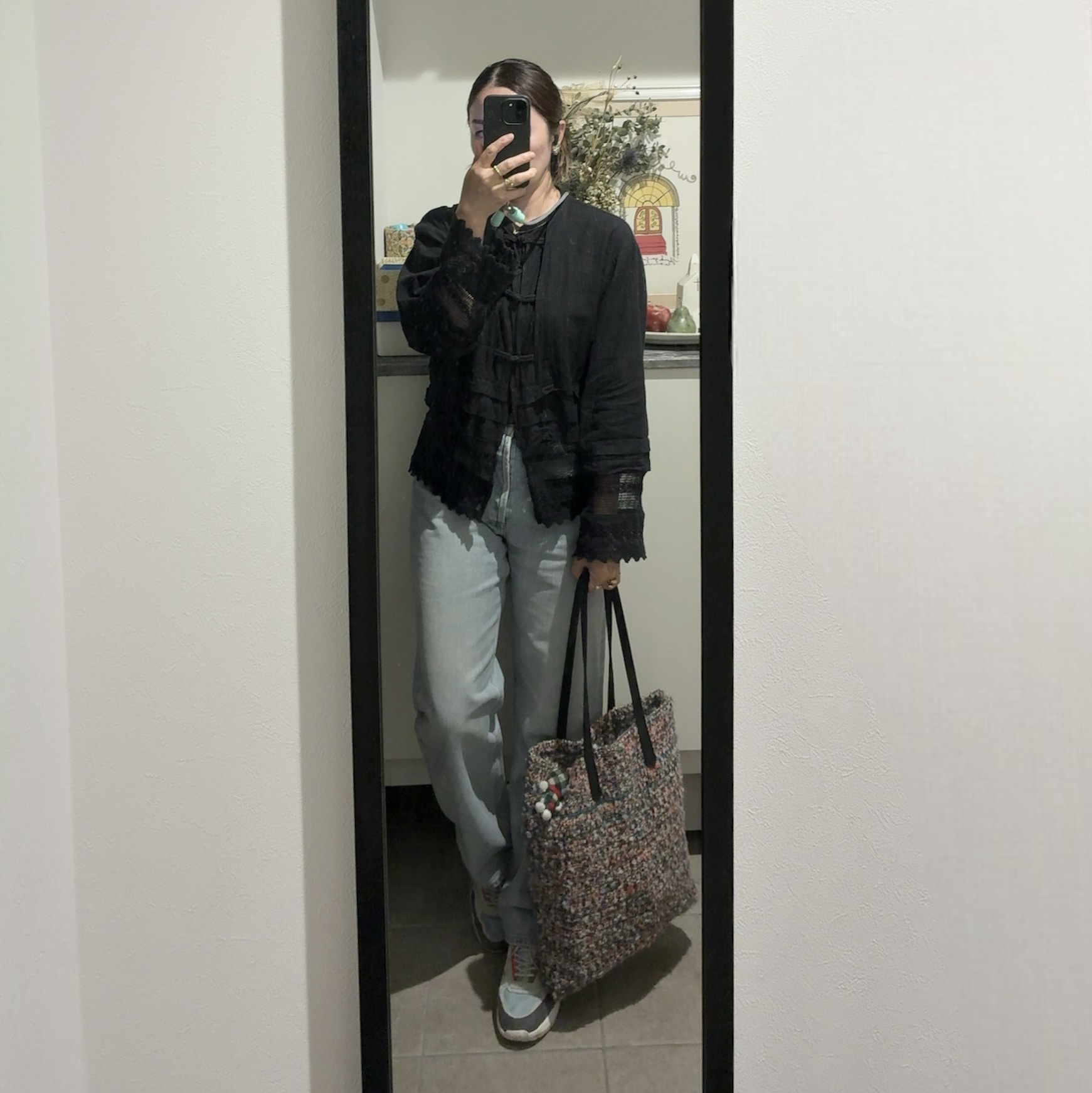 ニット/ZARA、デニム/TANGENET、スニーカー/KARUFU、バッグ/MANOUTIL、カマロアン