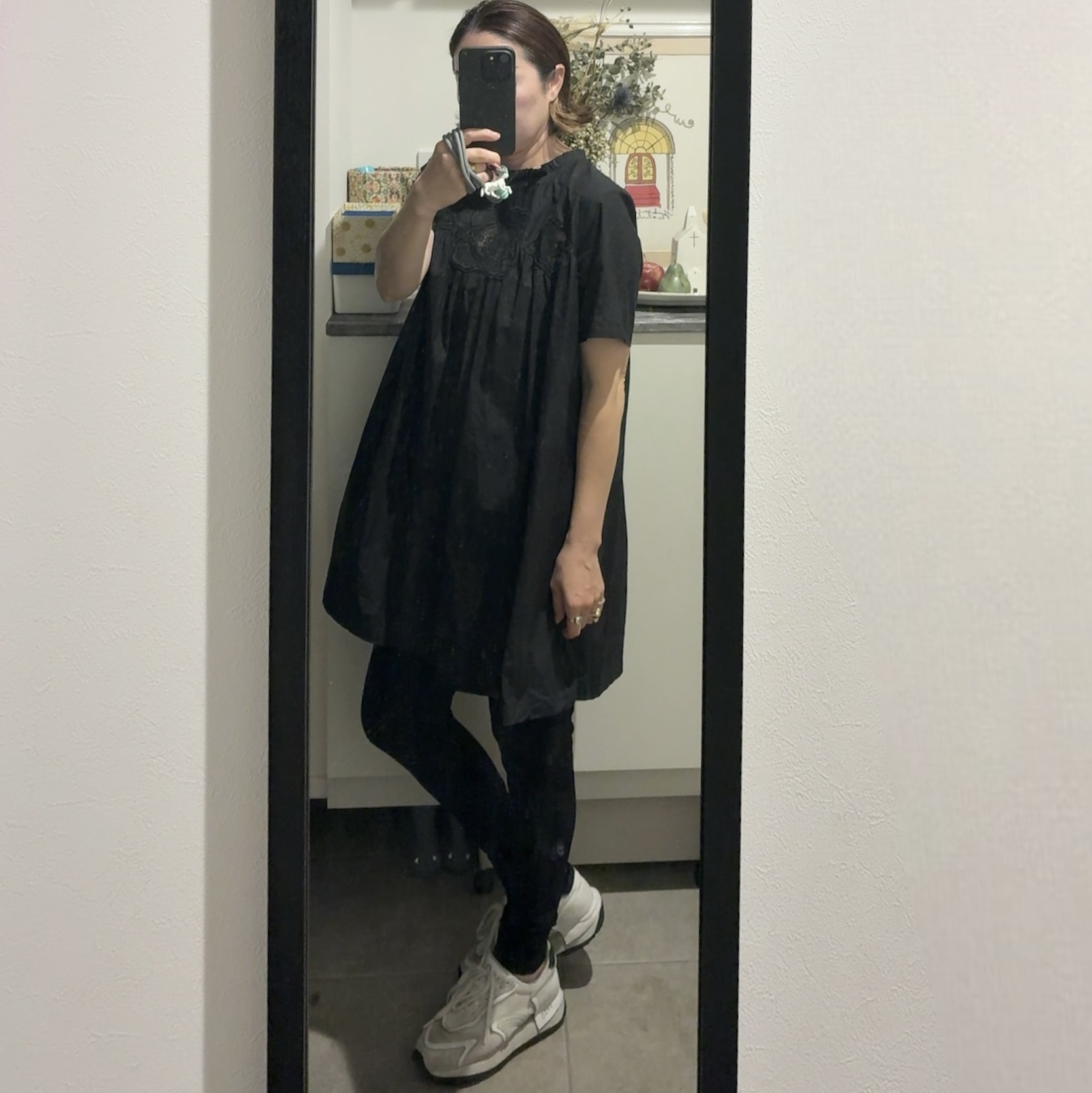 9月に入ってから購入した、ZARAのミニワンピース。襟元のタックディテールや胸元のレースが可愛くて購入しました。今時期にぴったりで、週イチで登場しています。カラーソックス+ミディ丈ブーツや、スキニーボトムとの合わせを楽しんでいます。この日はモノトーンでまとめたくて白の厚底スニーカーを合わせました。スニーカーはIYSO(イソ)という韓国ブランドのもの。人と被らないところと厚底でスタイルアップできるところが気に入っています。