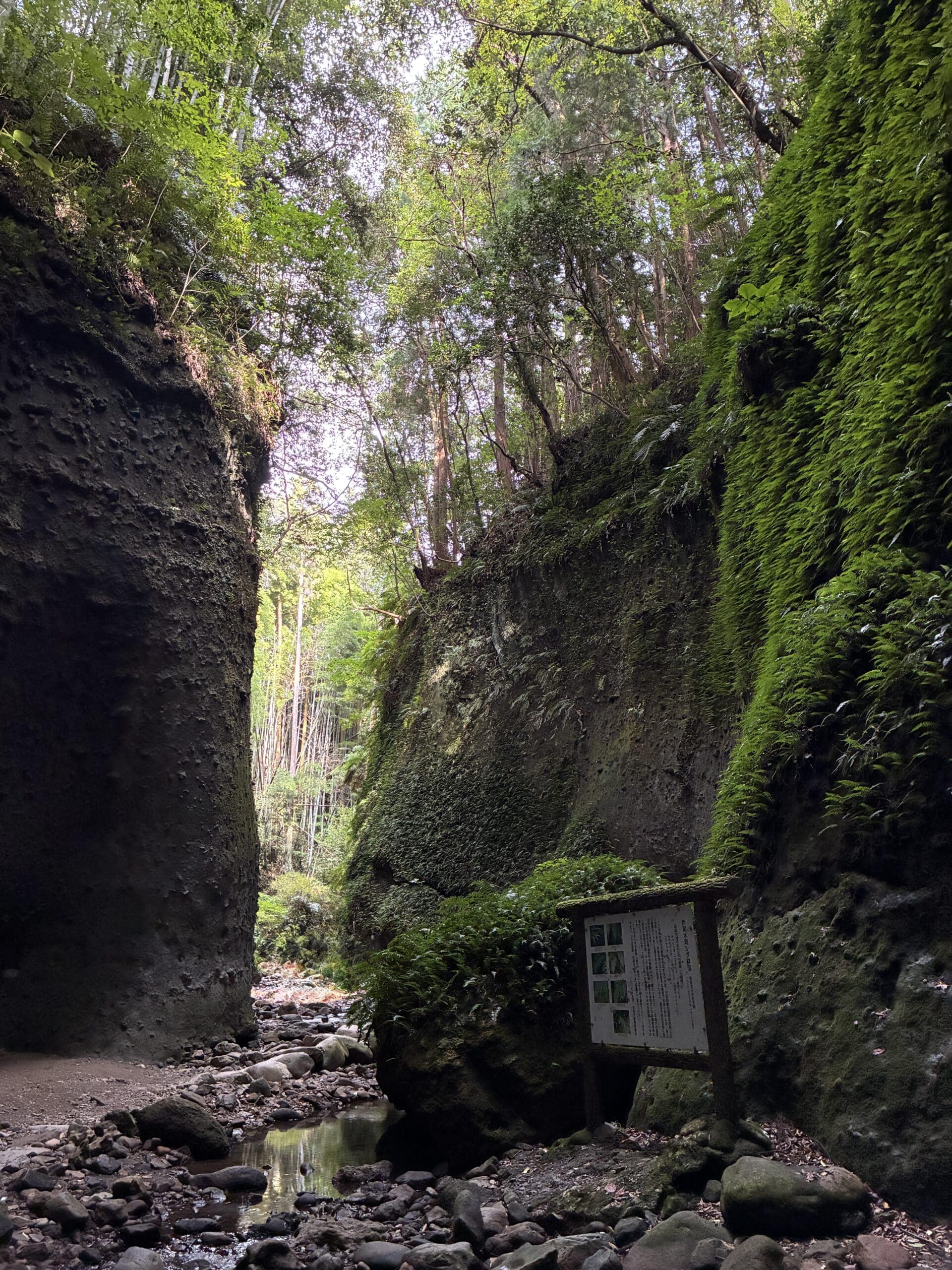 洞窟の中をくぐりながら、先にある滝を目指します。洞窟の中は風が通っていて気持ちよく、水が滴り落ちる様子や青々とした植物が印象的でした。
