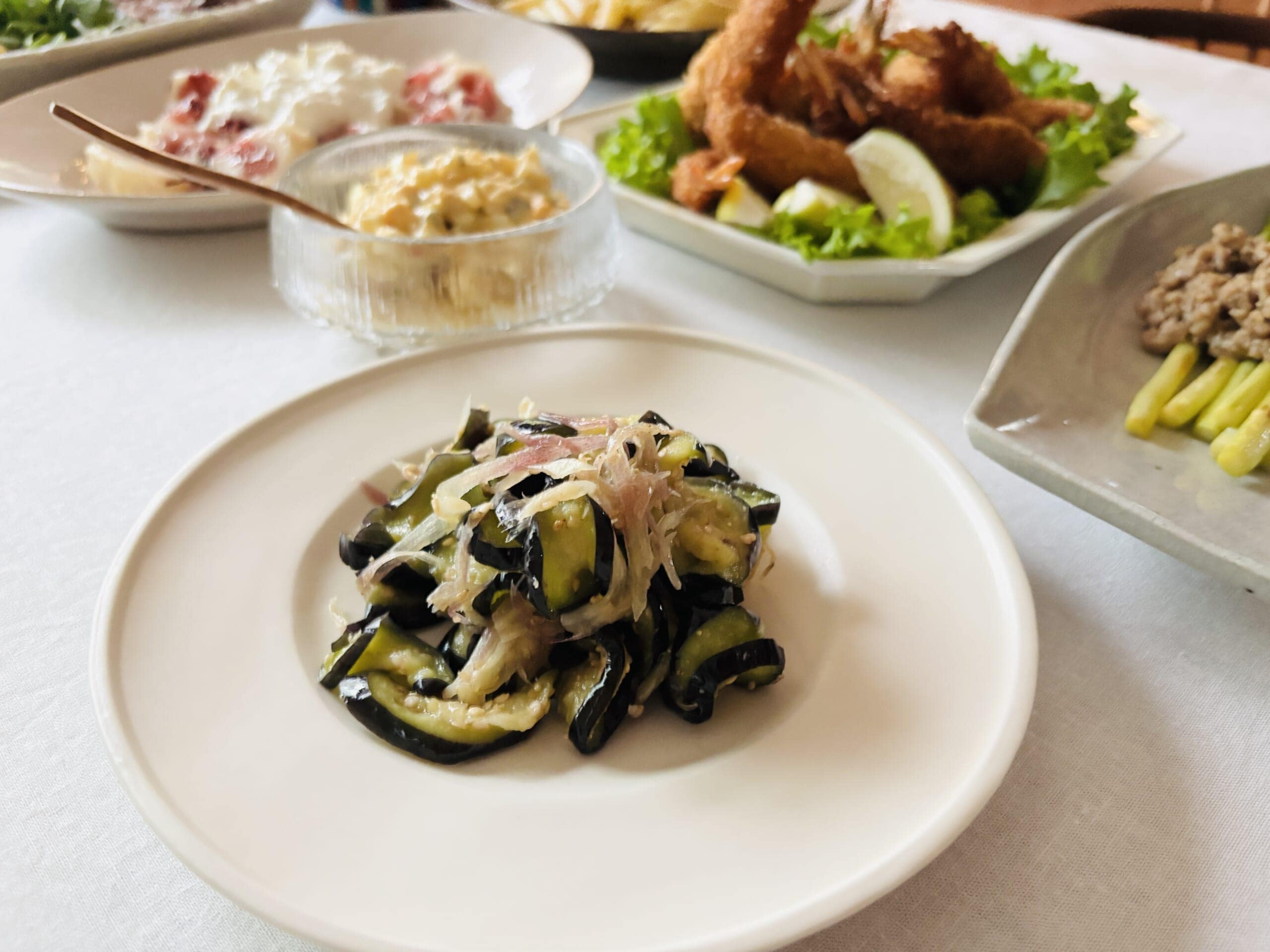 少し前に作って、簡単でさっぱりしてよかったので大人の箸休めの為にLEEレシピの”なすとみょうがのナムル”も1品に。