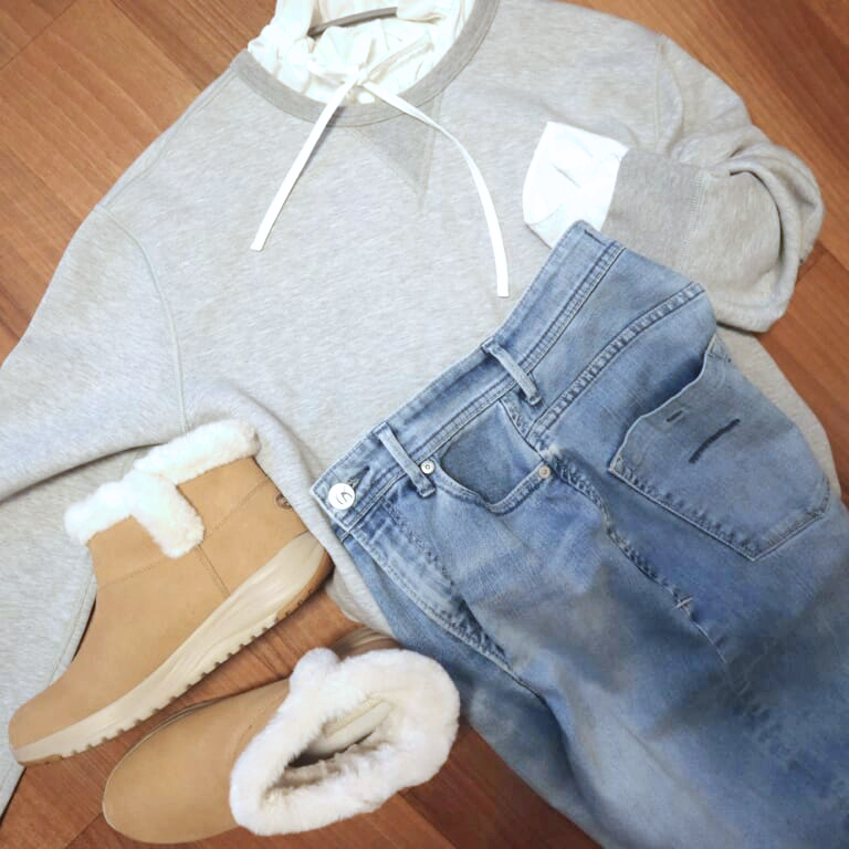 カジュアルな組み合わせですが、足元からチラッと見えるファーが柔らかく、女性らしい印象に◎