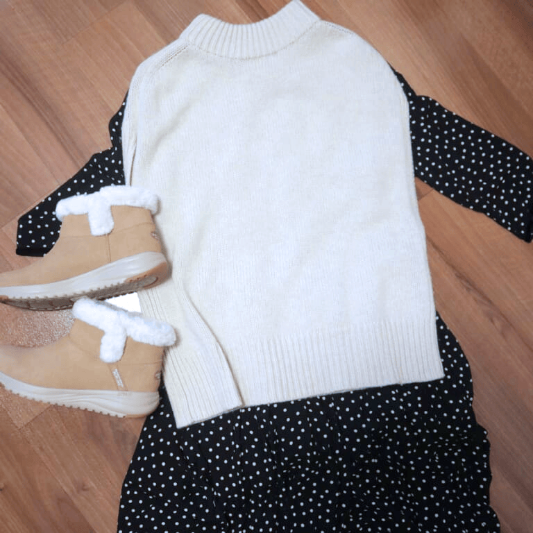 フェミニンなドット柄ワンピースは、ニットベストとブーツでカジュアルダウン。足元にボリュームをプラスすることで甘くなり過ぎない印象に。