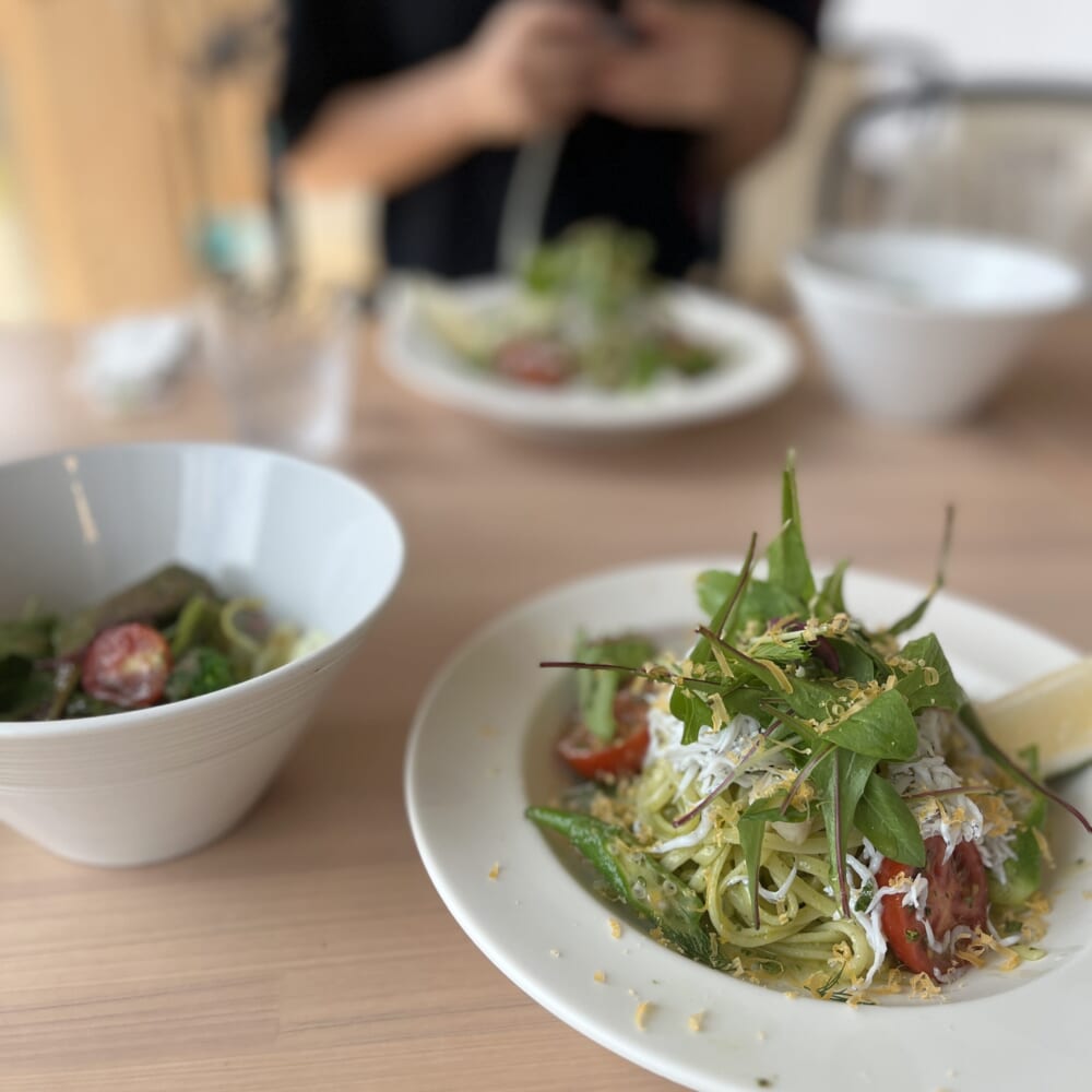 秋めいて過ごしやすい日でしたが、たくさん歩いて少し暑くなり、2人でしらすとフルーツトマトの冷製ジェノベーゼをいただきました。