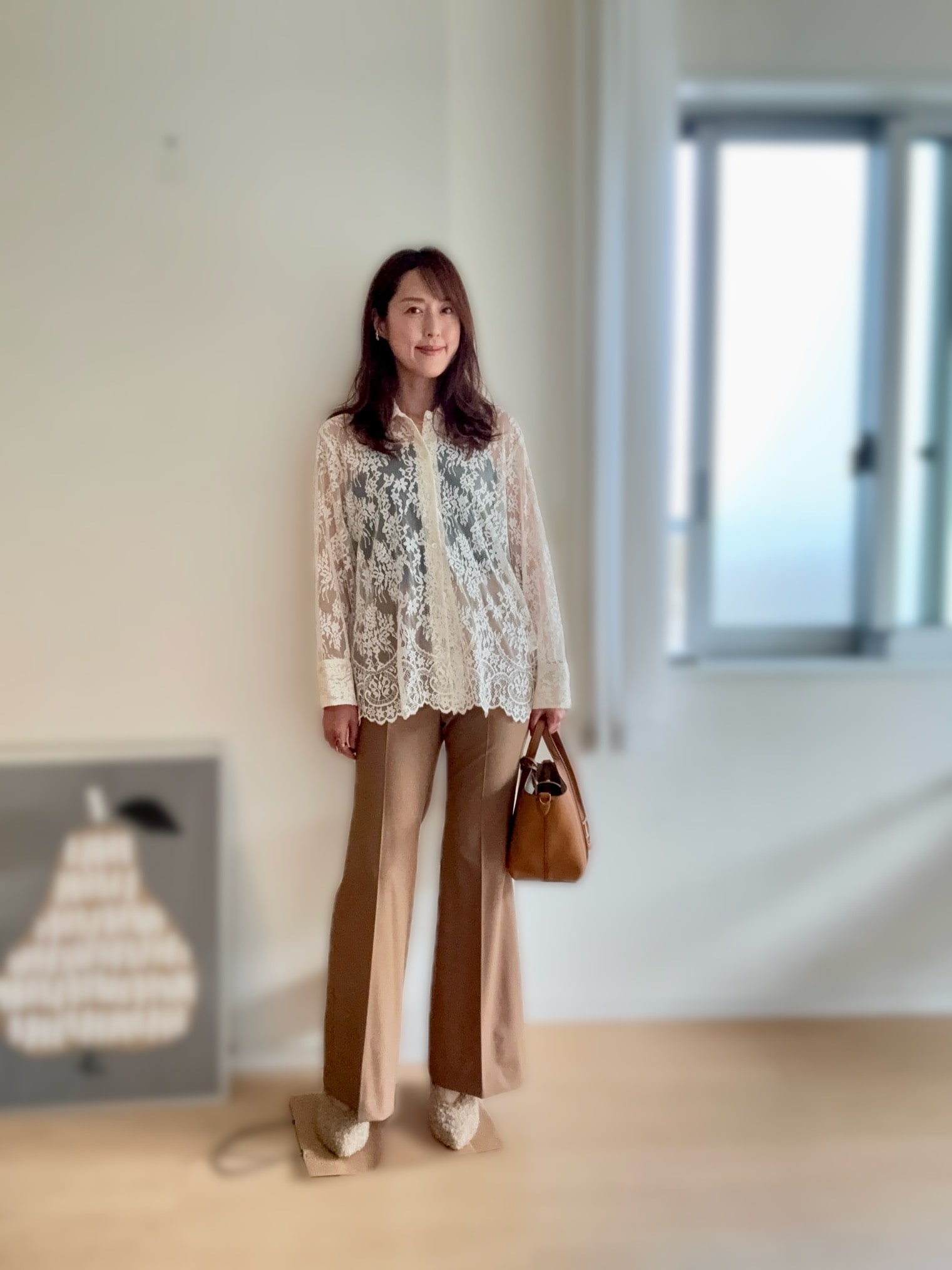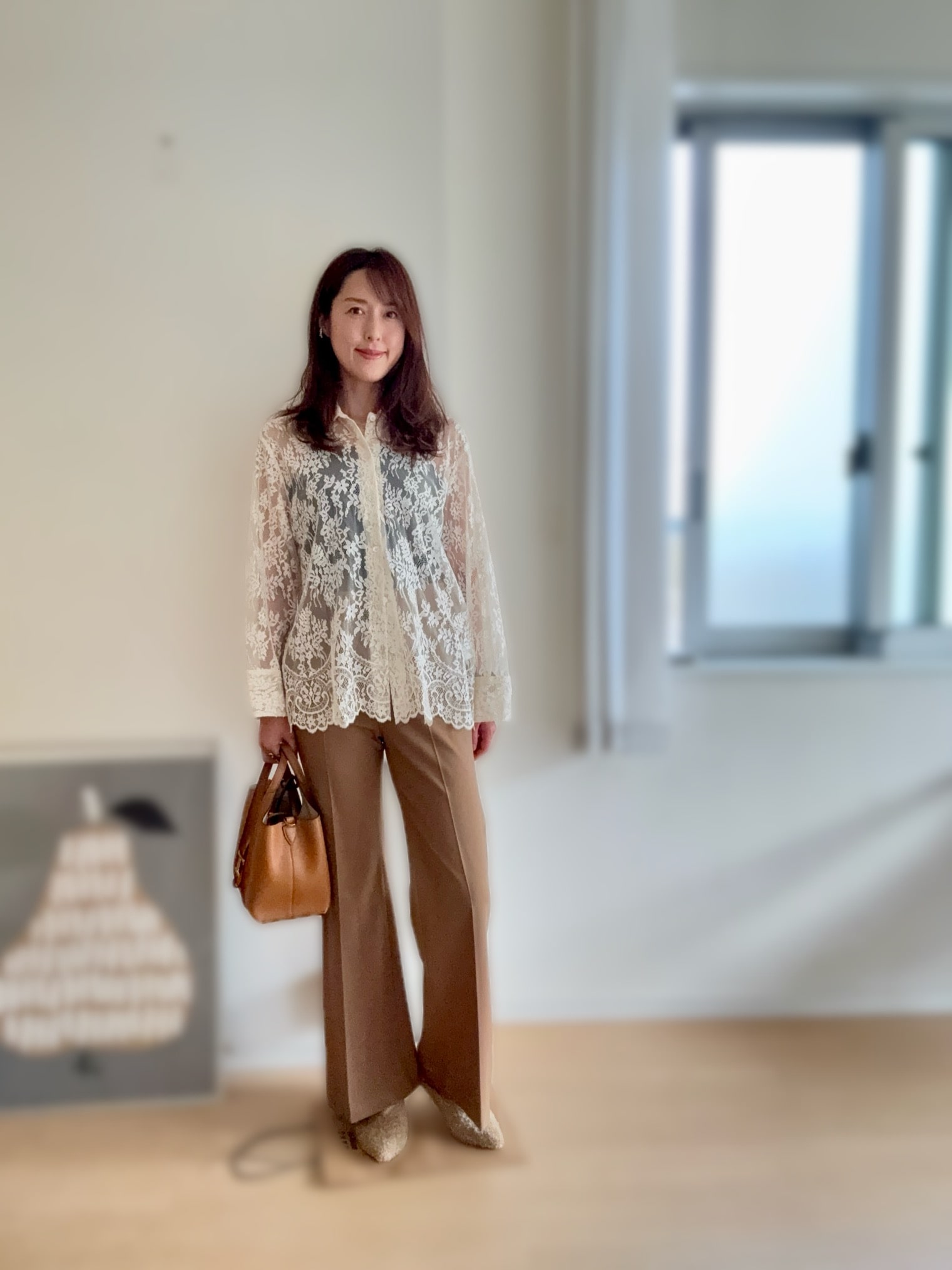 レースシャツは去年か一昨年に買ったもの。この気温にちょうどいいのです。裾がちゃんとスカラップなので、寒い時期はニットの裾からちらっと見せて着ても可愛い。
