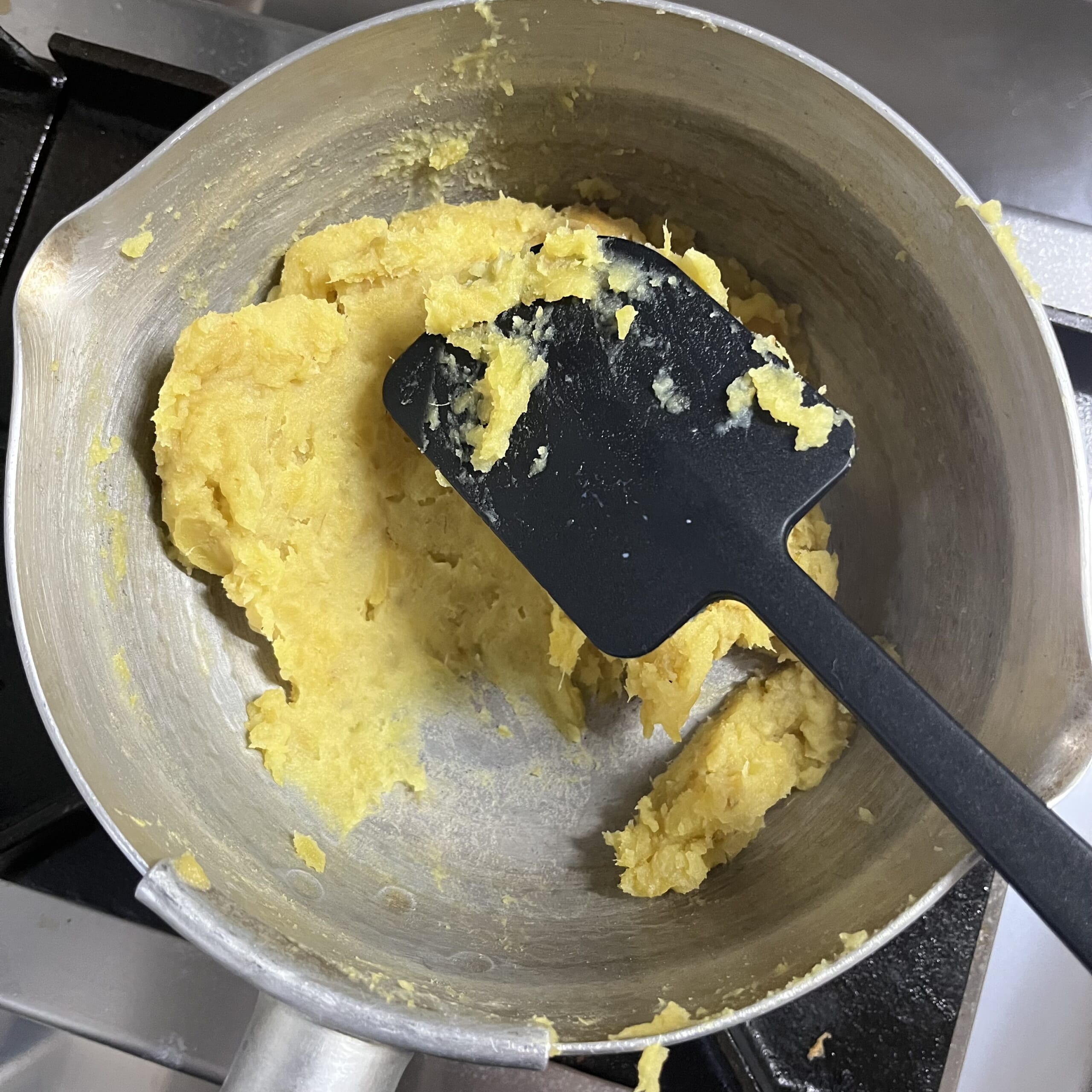 スーパーで買ってきた焼きいもを使用して作りました。シナモンパウダーは子どもが嫌がるかな…と思い、後からトッピングで!ということにしました。