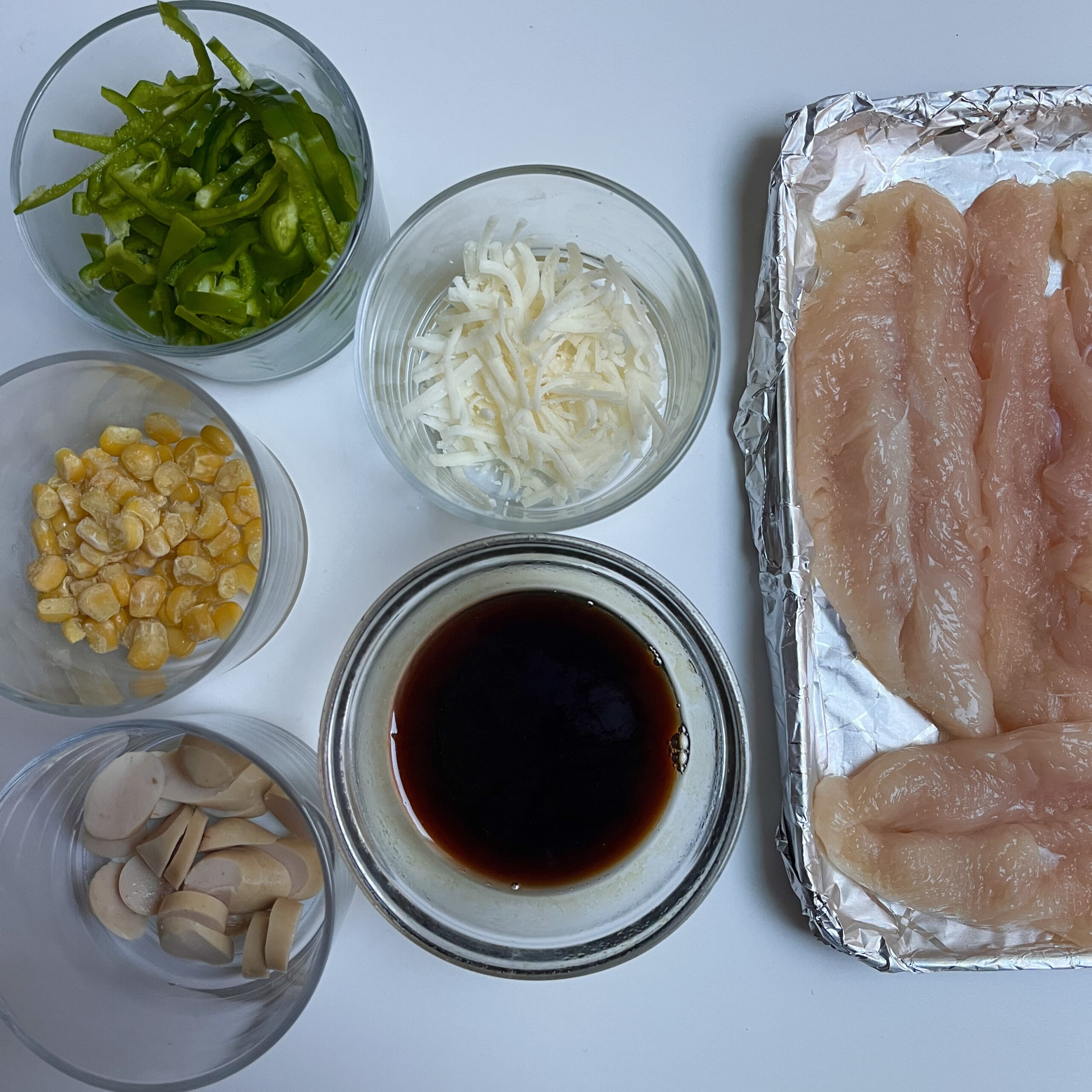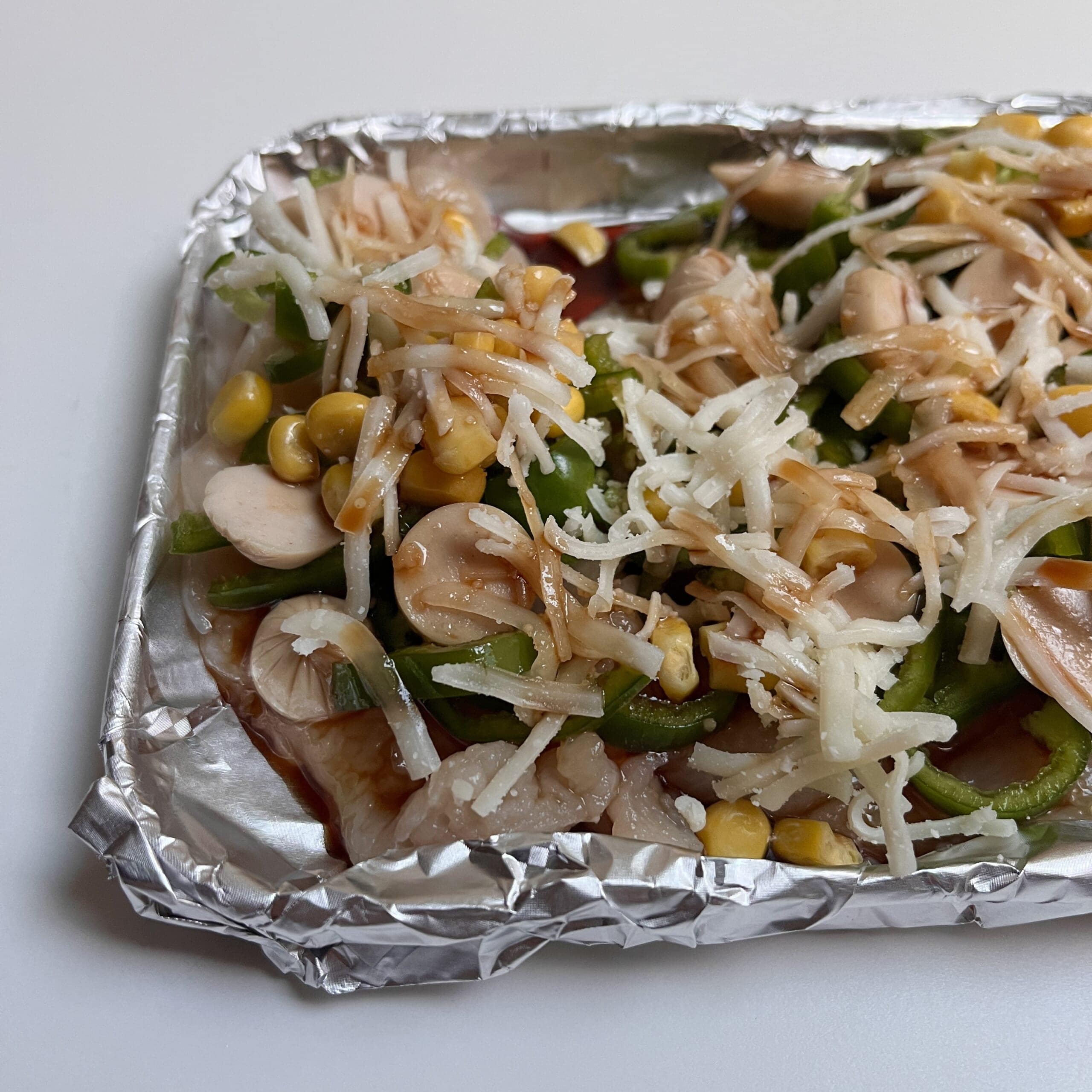 トッピングは何でもOKだったので、今回は薄切りピーマン、ソーセージ、コーン、チーズを使いました。
