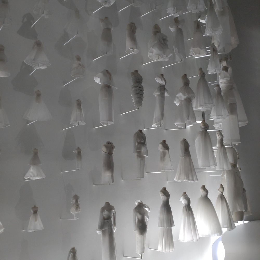 壁一面に並ぶトワル。ディオールのもの。幻想的でずっと見ていられるほど美しい。