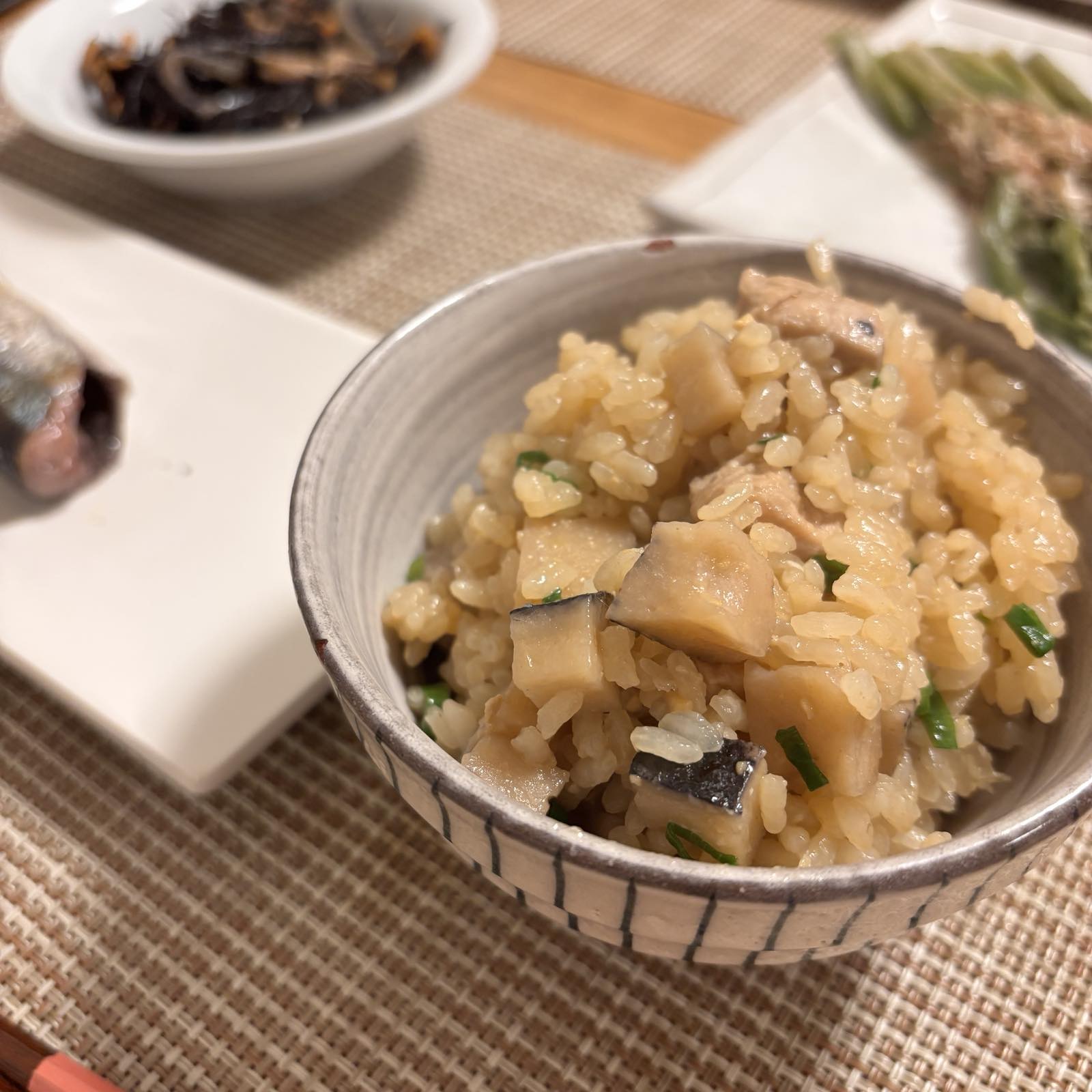 炊き込みごはんのいいところは、食卓がなんか楽しくなるところ。のような。そして副菜?他のおかずをがんばらなくても、副菜が良く見えるというか(手の込んだ食卓になってくれるというか)と勝手に思っています。