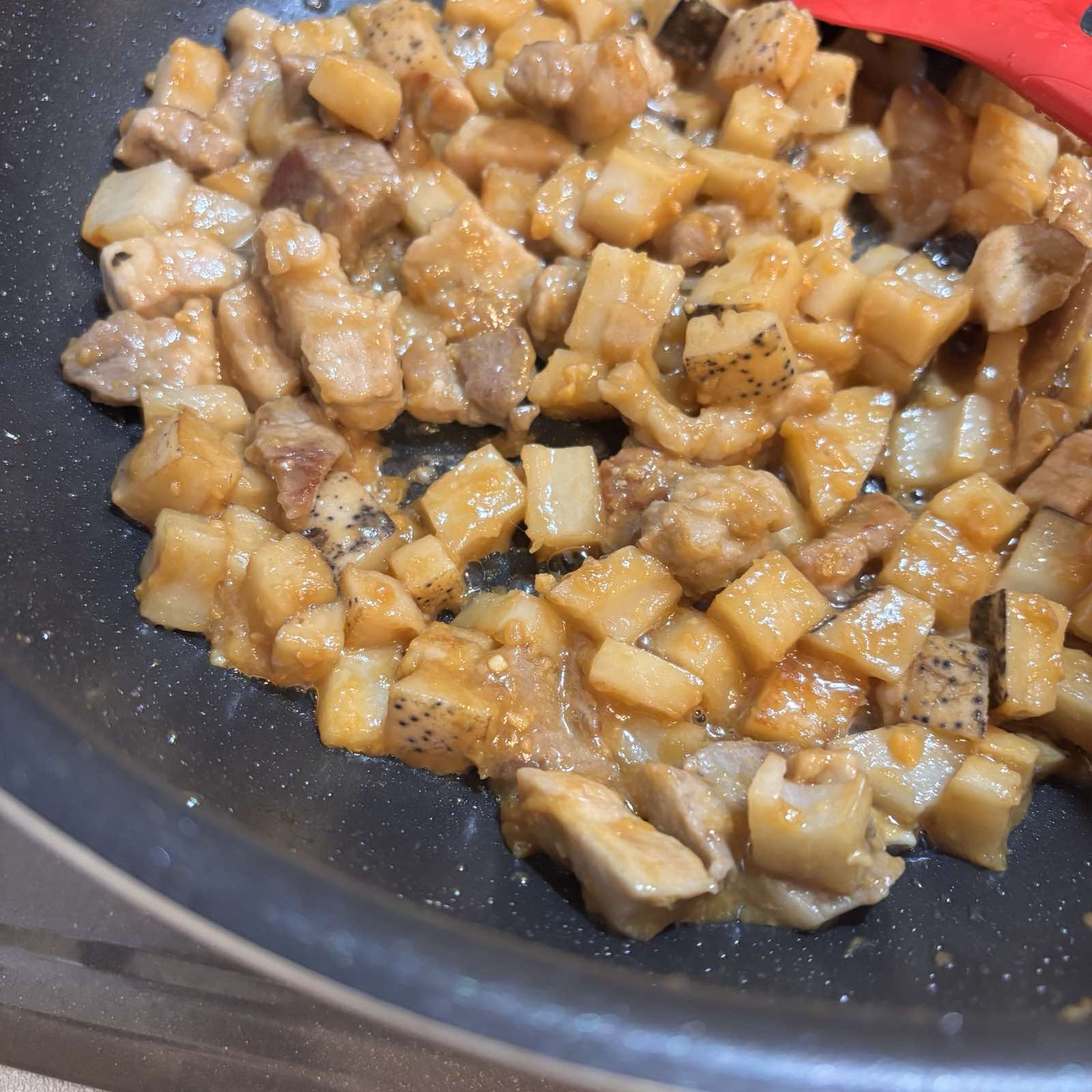 本当は「豚バラ厚切り肉(焼肉用)」に焼き目がつくまで炒めます。今回トンカツ用のお肉を使ったので少し長めにじっくり焼いてみました。