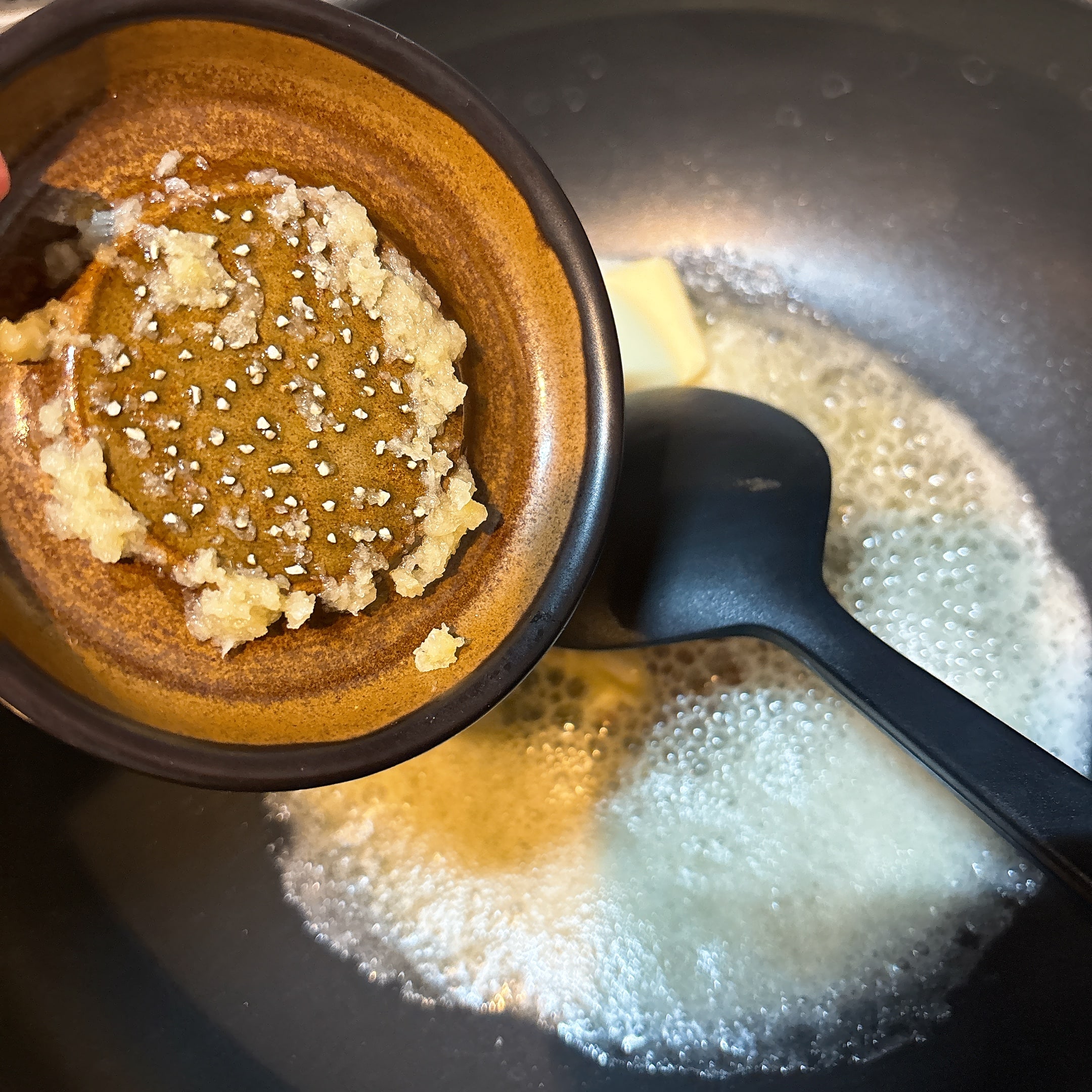 溶かしたバターにすりおろしにんにく入れまーす。