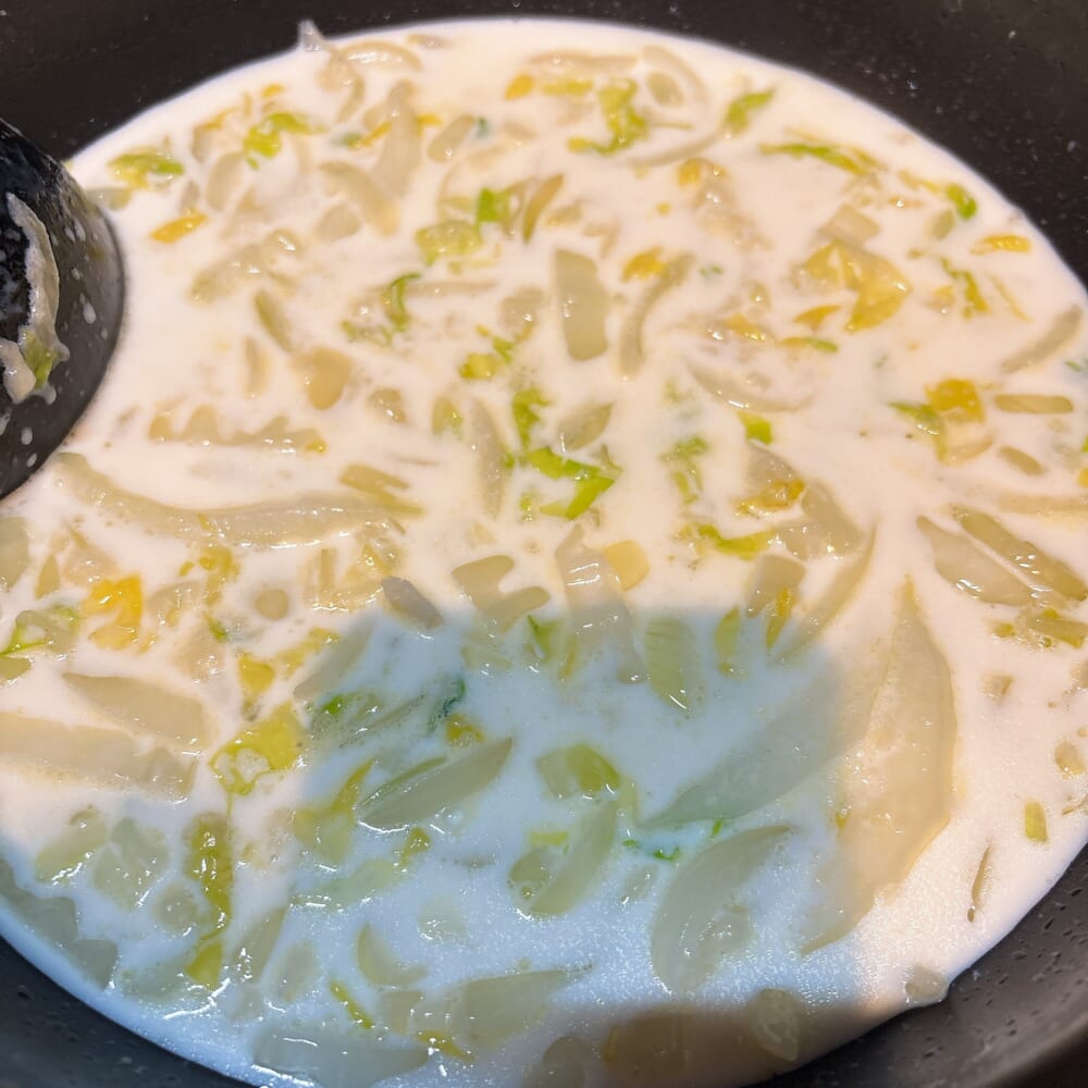 ここでポイントなのはこの段階でとろけるチーズの半量を先にこのベシャメルソースに混ぜること!!そうするとチーズのコクで美味しくなる。すごいアイデア。