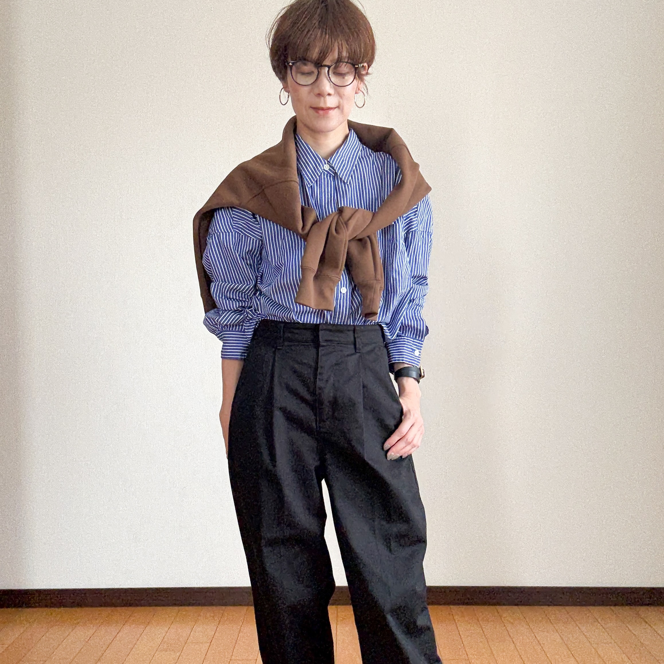 ブルーのストライプシャツにブラウンのスウェットを肩掛けでアクセント。