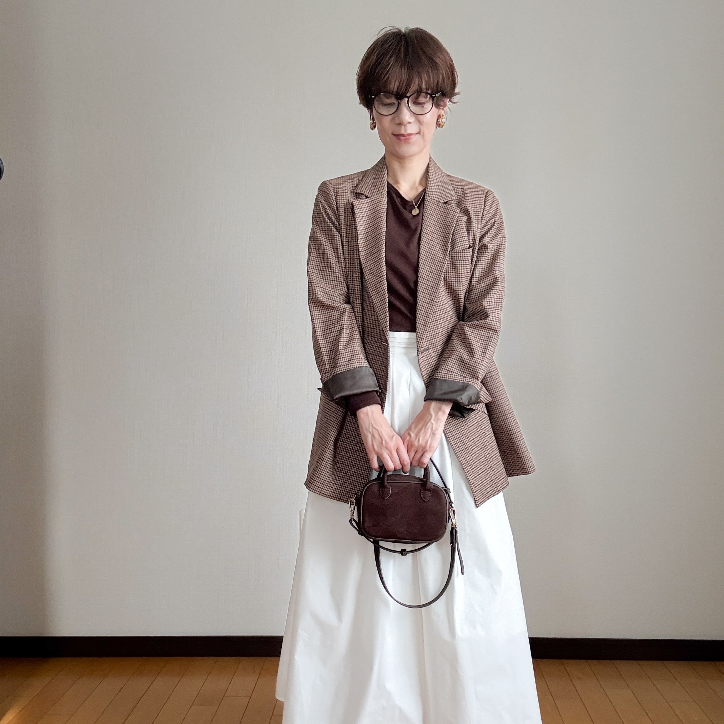 チェック柄ジャケットに白のスカートとカチッとしつつも女性らしさをプラスしたコーデに、さらにミニバッグで甘さを。ミニバッグでコーデに遊び心を足せてるかなと。