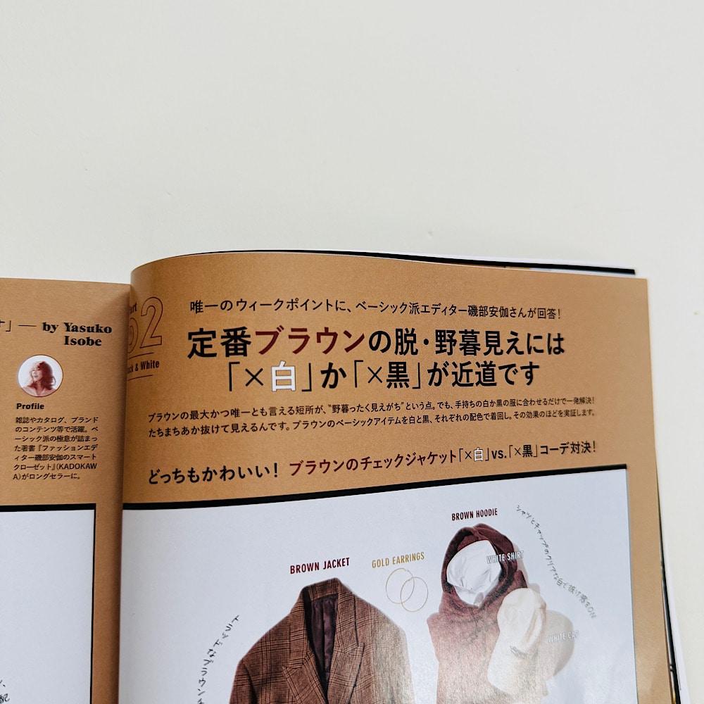 特集にあるように、ブラウンは確かに合わせ方によっては野暮ったく見えてしまうことも。特にアースカラー系と合わせるときは要注意なイメージ。なので、”脱・野暮見え”ポイントはとっても参考に!