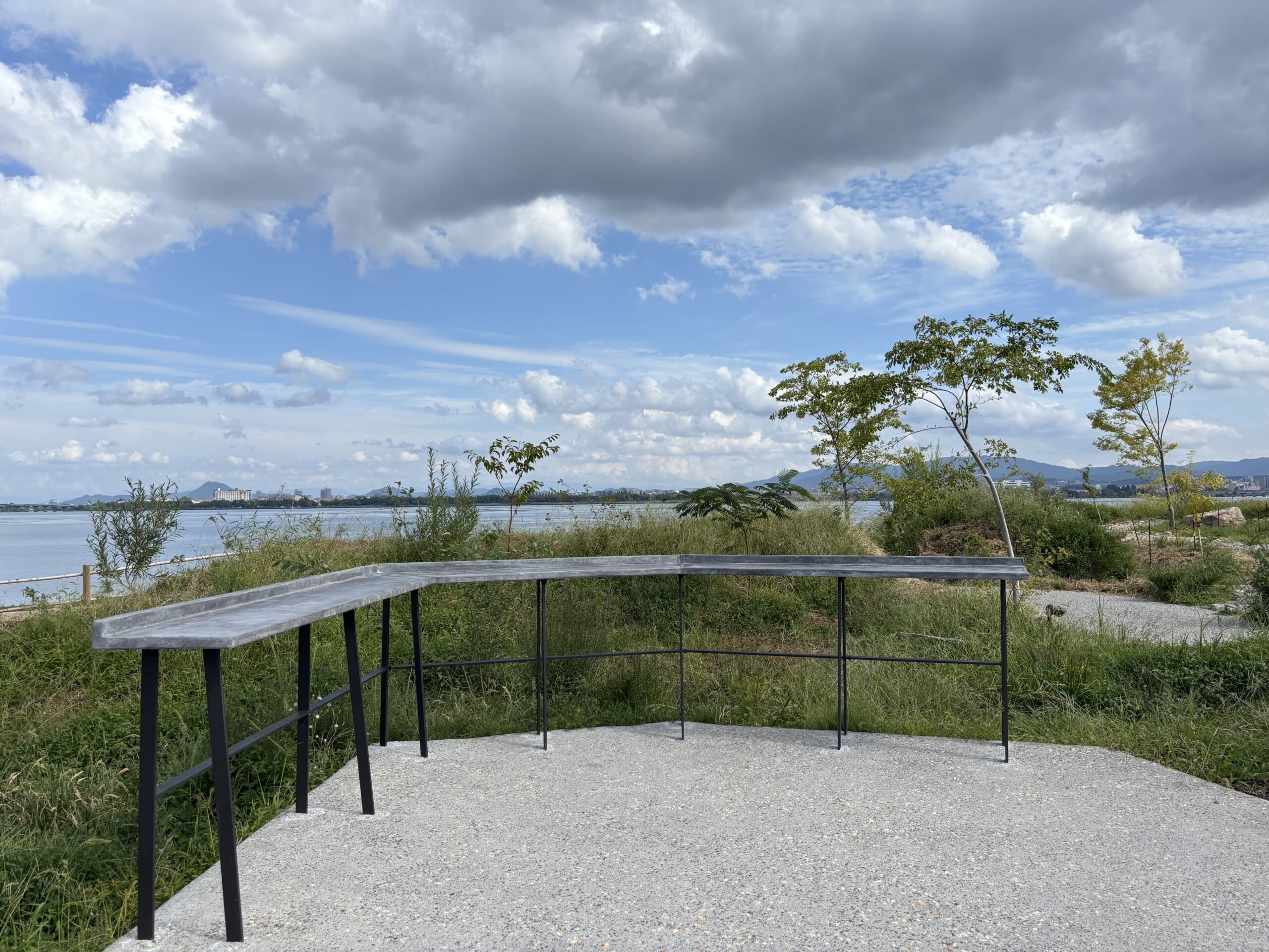 建物の写真はこれしか撮っていませんでした。(もっとちゃんと撮っておけばよかった!写真からは全く伝わらないと思いますが素敵な建物なんですよ。)これはカフェ側。カフェには大きな窓があって琵琶湖を眺められるようになっていました。今の季節はテラス席に座るのも気持ちよさそうです。