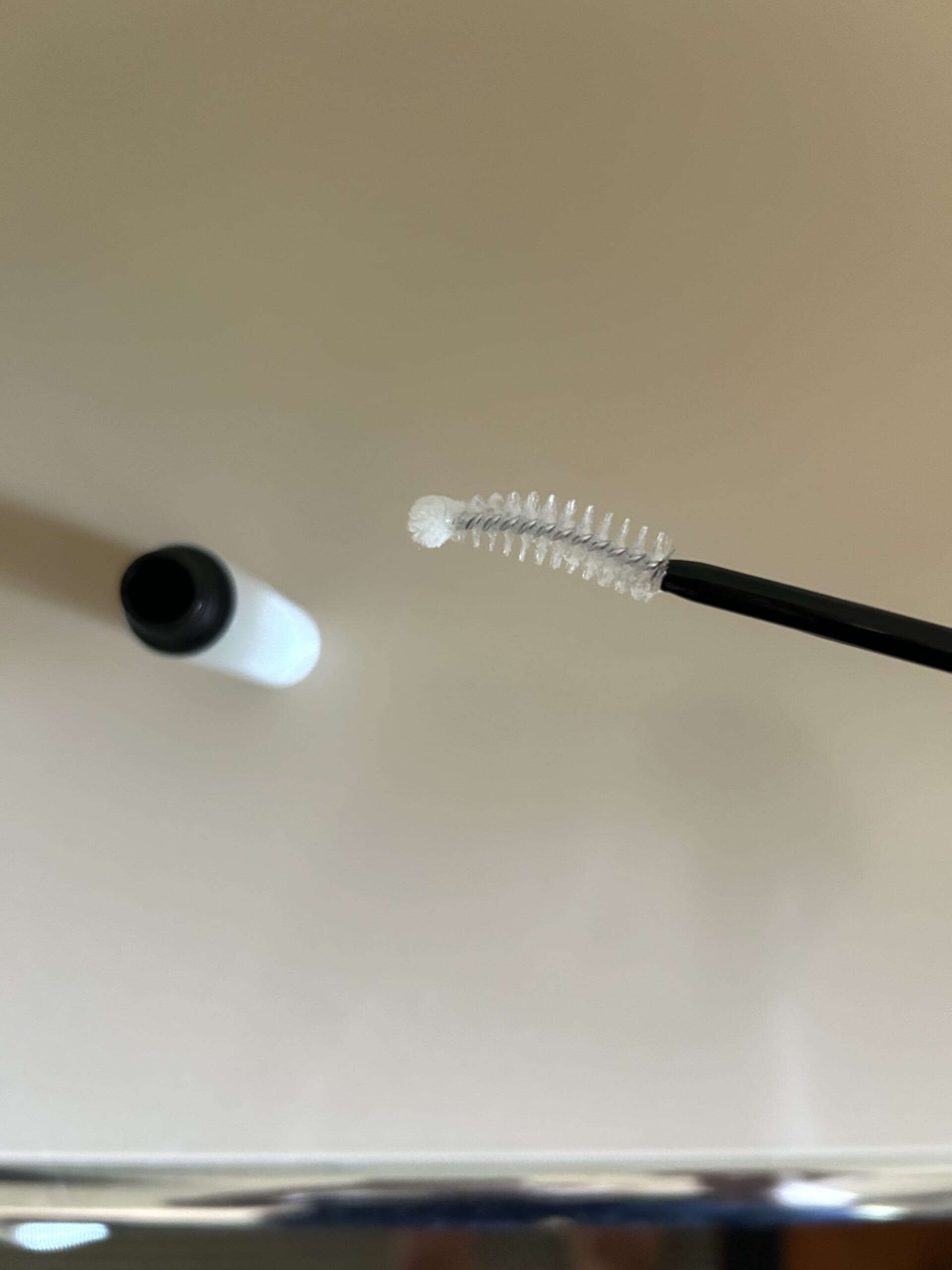 マスカラブラシでまつ毛に美容液を塗布し、先端でまつ毛の生え際になじませます。