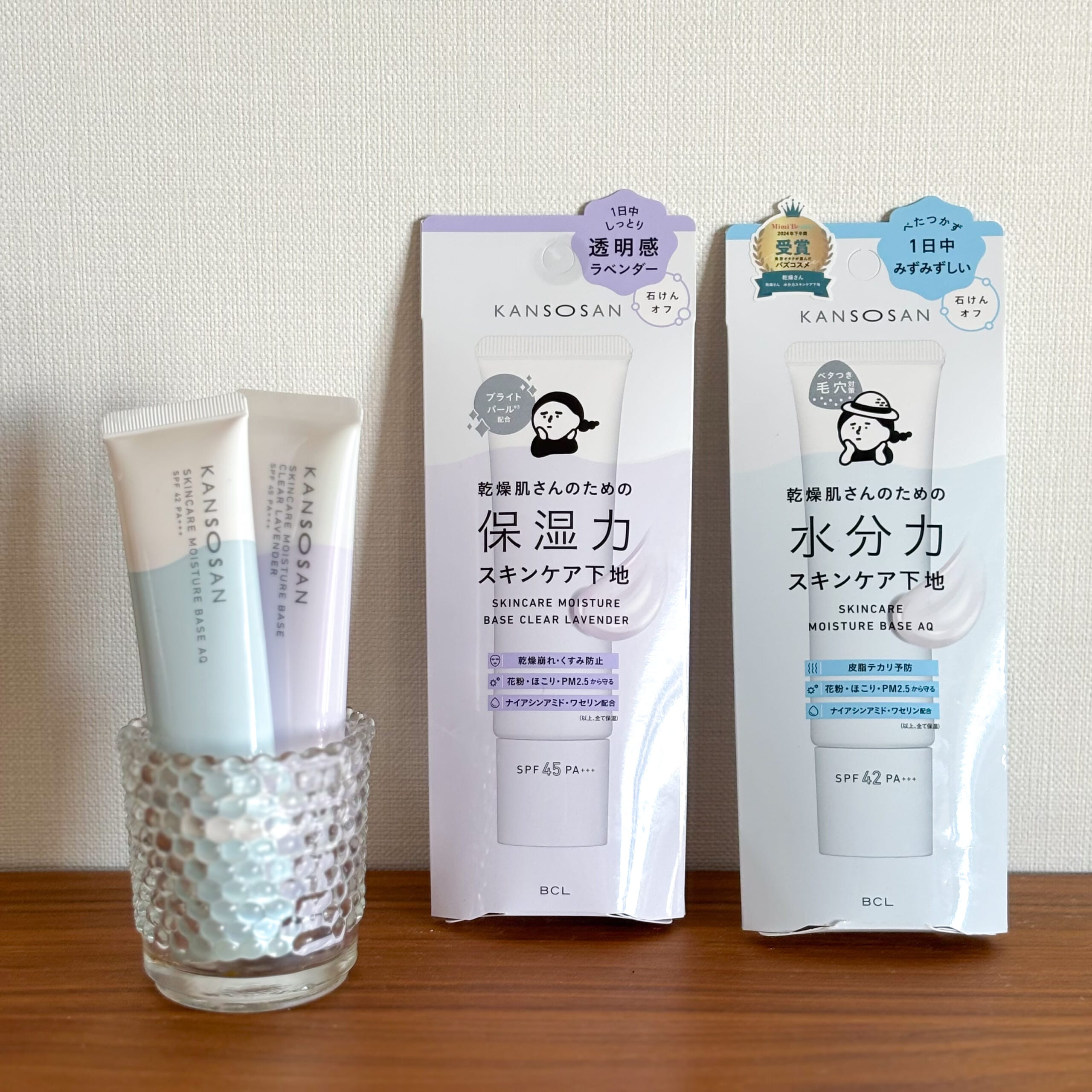 私は、全顔に「乾燥さん水分力スキンケア下地」を使った後、顔の中心部分に「乾燥さん保湿力スキンケア下地 透明感ラベンダー」を重ねています。