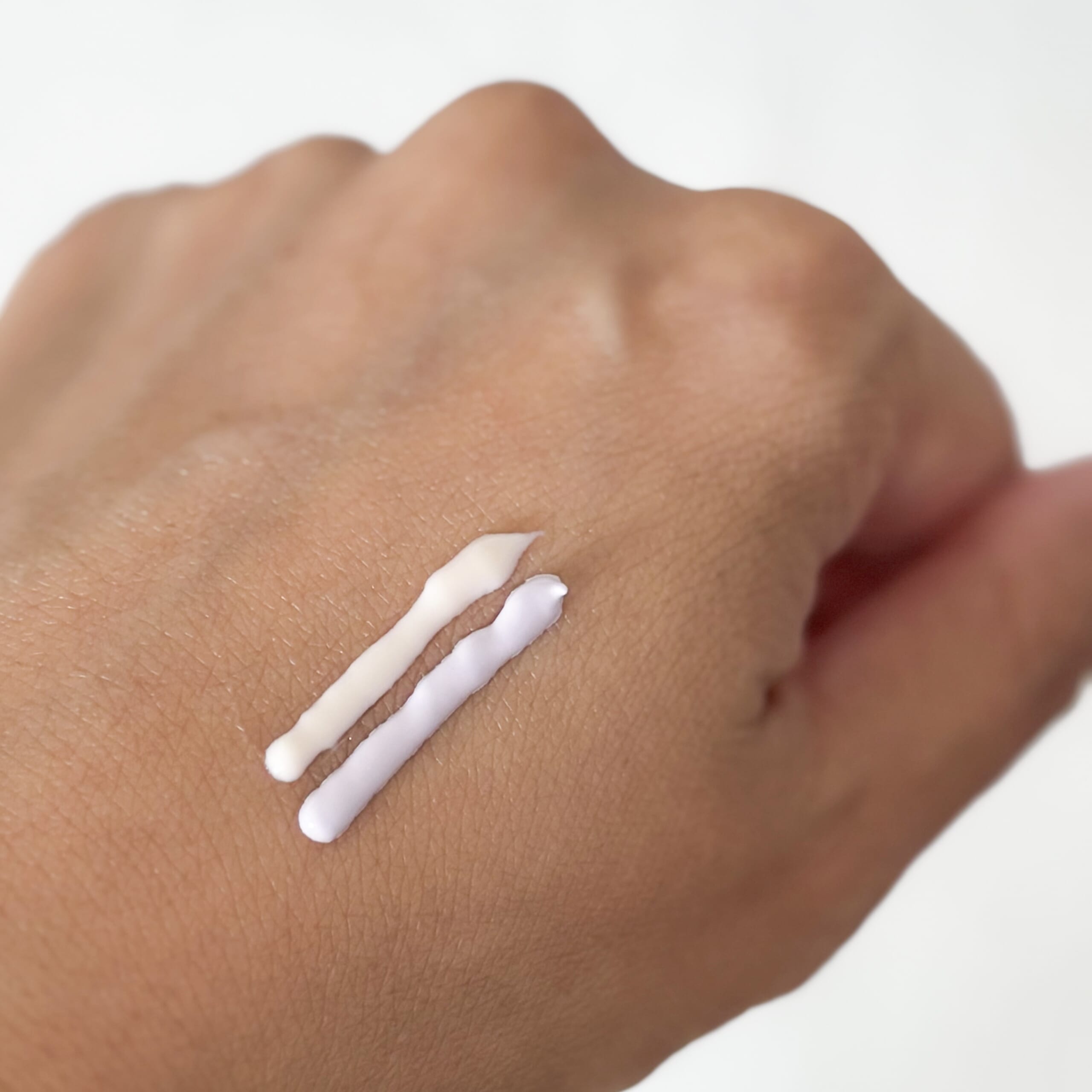 左側が「乾燥さん水分力スキンケア下地」無色でラメなしです。右側は「乾燥さん保湿力スキンケア下地 透明感ラベンダー」パッケージを見てピンクっぽいラベンダーを想像していたのですが、実際は水色に近いラベンダー色でした。パールが入っているのでよく見るとキラキラしていて、つけると肌に艶感が生まれます。