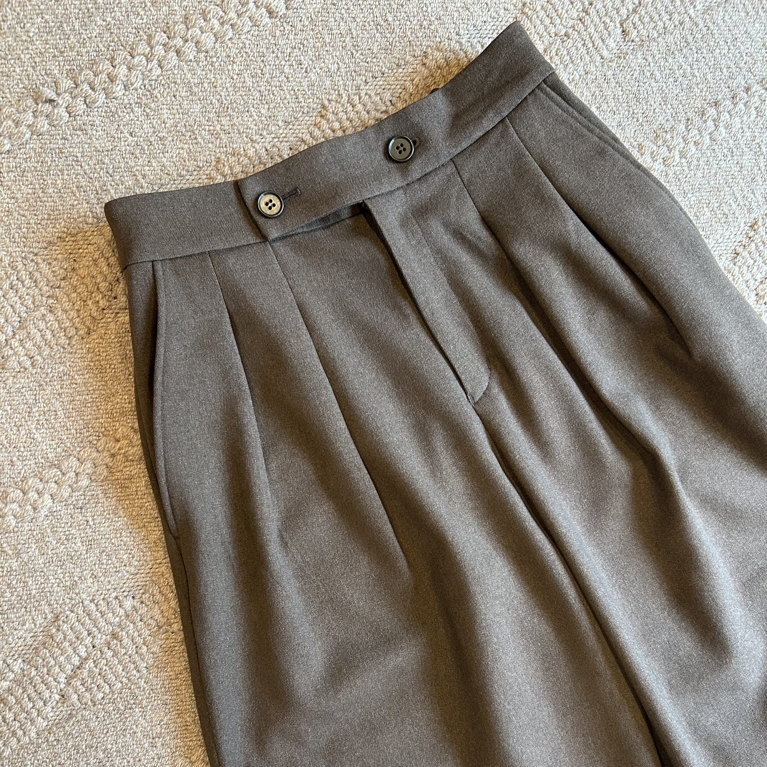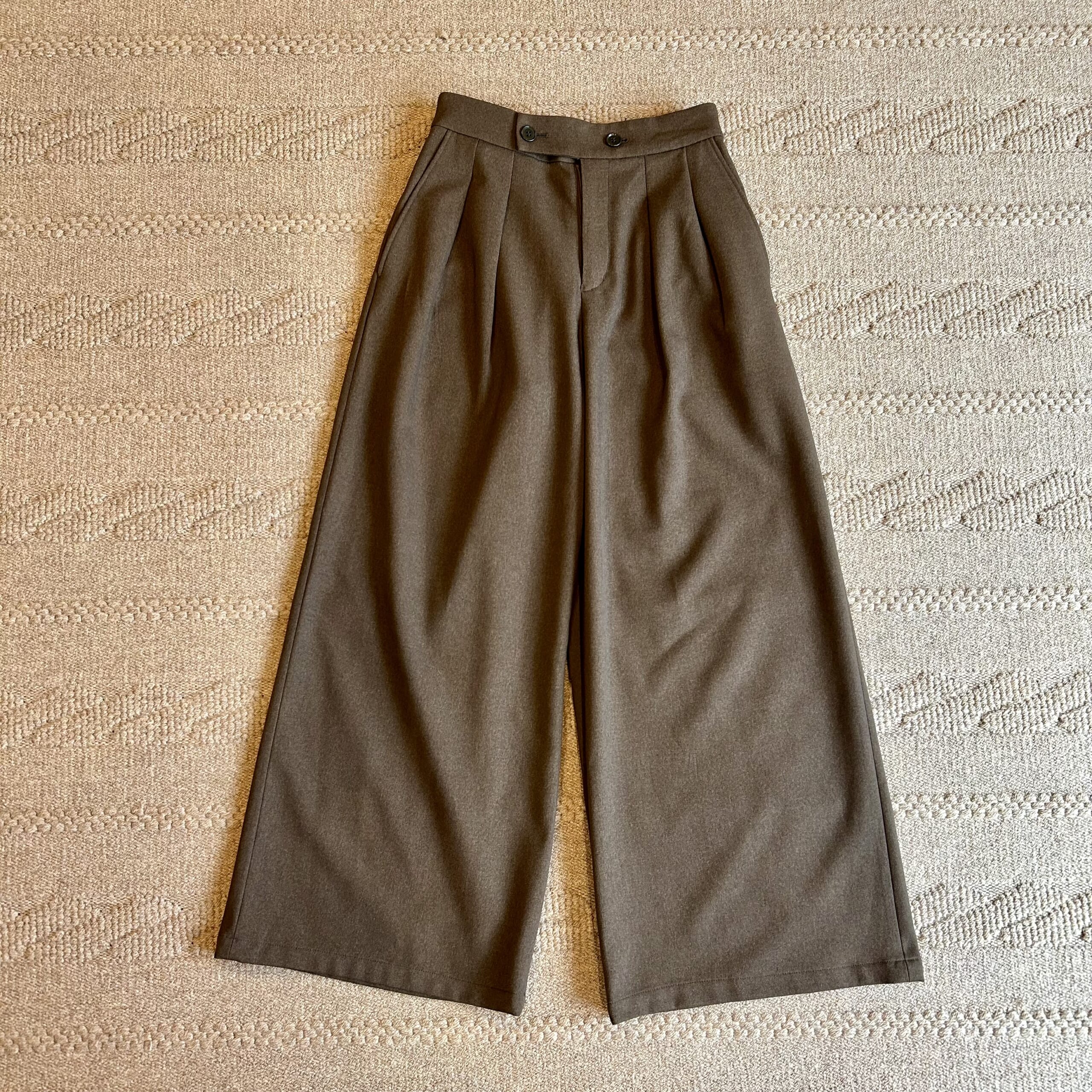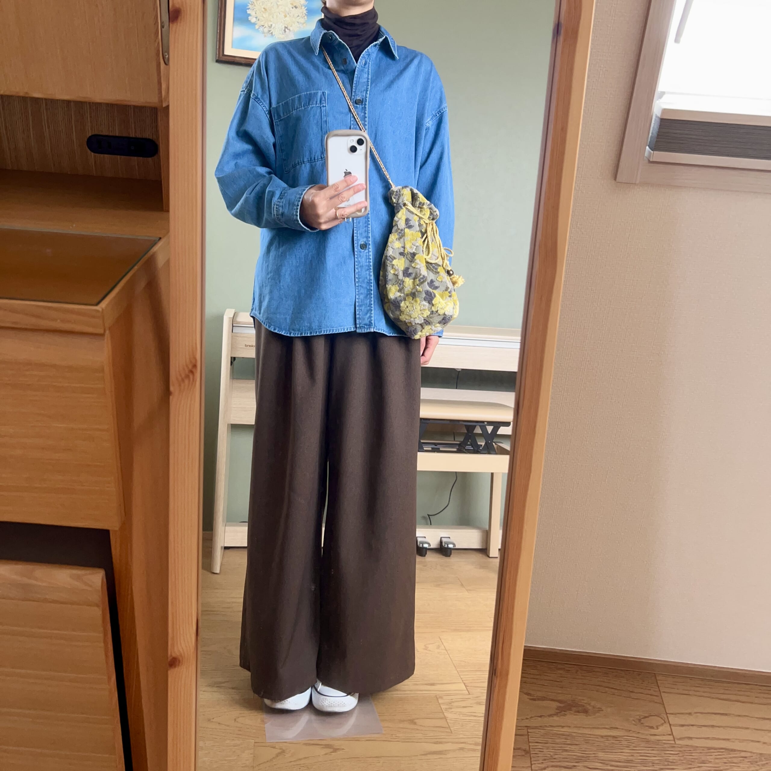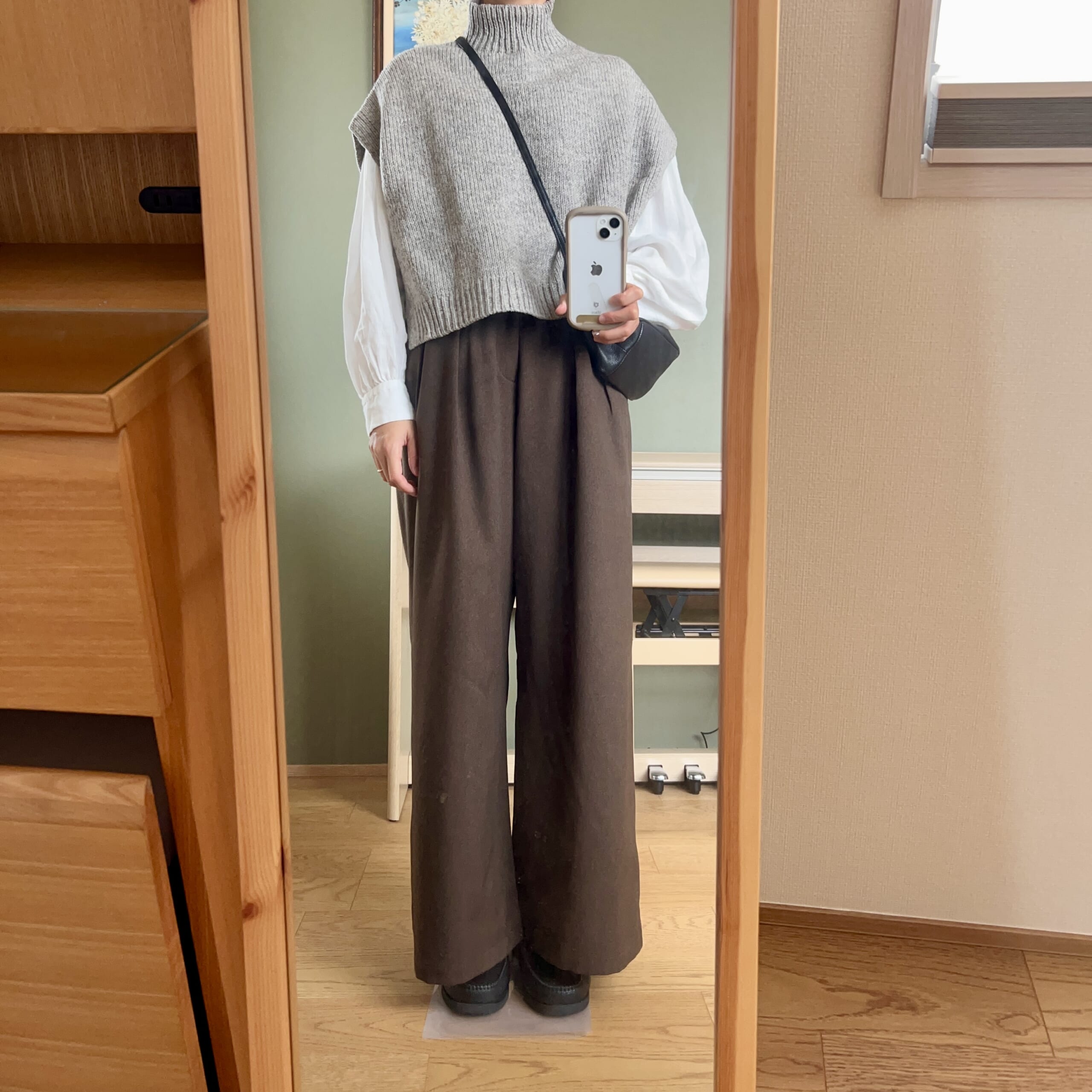 ブラウンのパンツも欲しいと思っていて、こちらにしました。ウール見えしますが、生地はポリエステル100%で、洗濯機洗い可。かつてはチノパンなど綿100%が絶対!と思っていましたが、洗えてシワになりにくい機能的な一着に年々寄っていっている気がします。