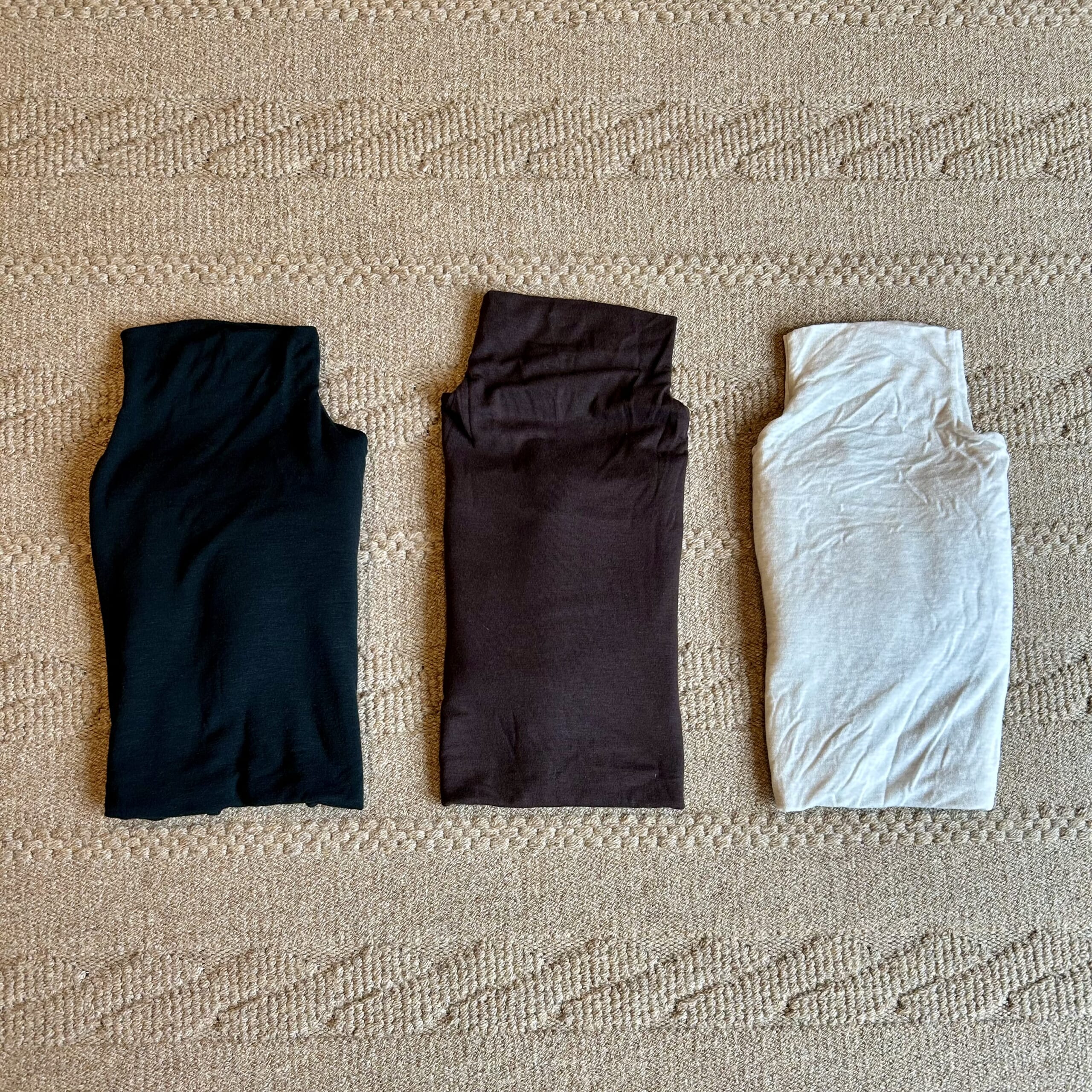 こちらのタートルを持っている方は多いのではないでしょうか。柔らかくて着心地が良いです。昨シーズンはナチュラルとブラックを愛用していたので、ダークブラウンを追加しました。暑い日もあれば、急に寒いと感じる日もある今日この頃。シャツの中に一枚入れればちょうどいい服装になるので、今の時期から重宝しています。