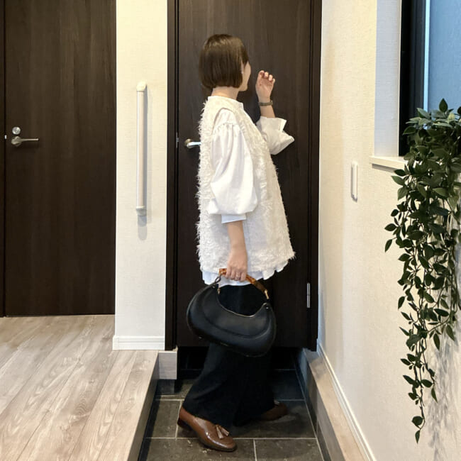 jilet…fredy emue、blouse…green label relaxing、pants…LOWRYS FARM、shoes: green label relaxing bag:LE VERNIS