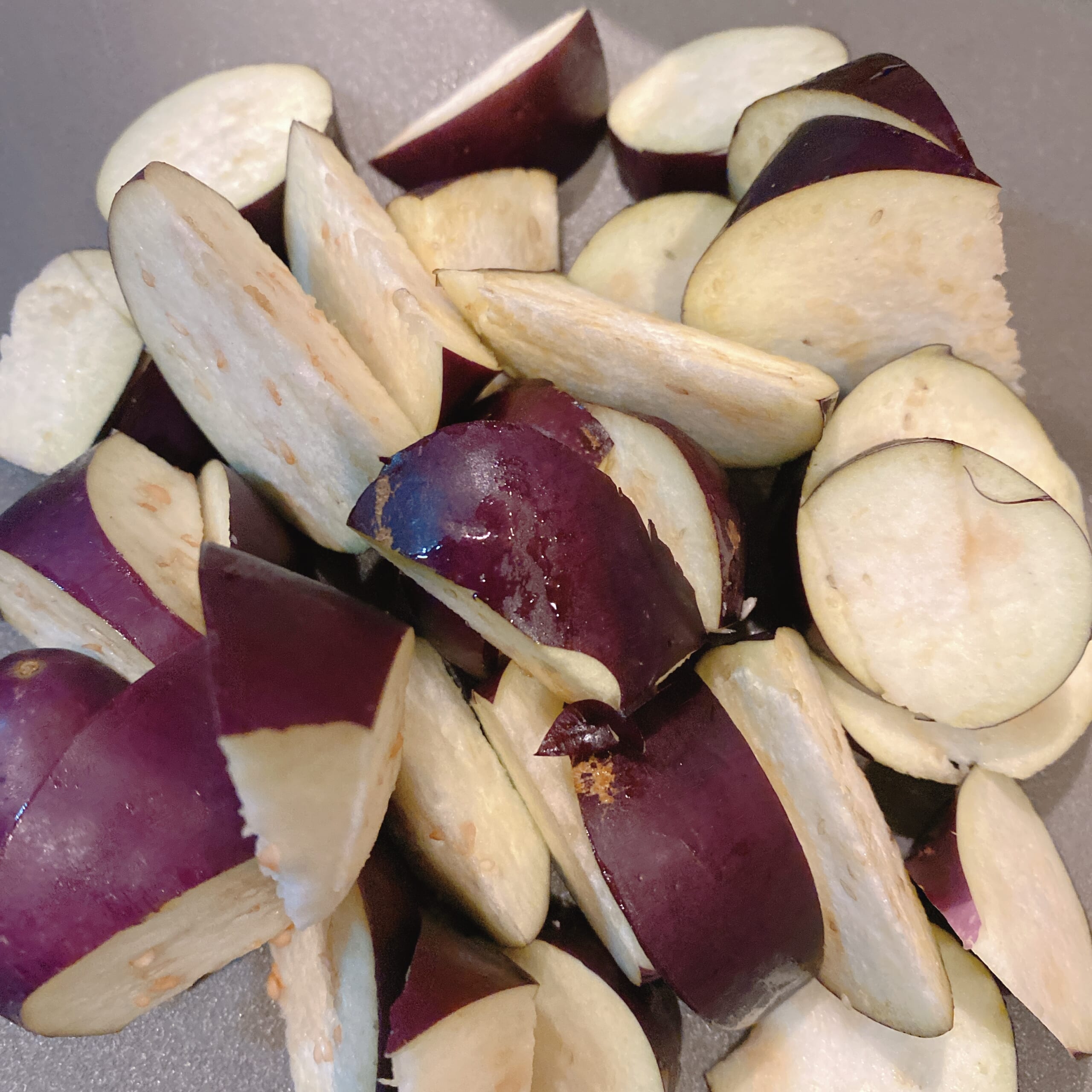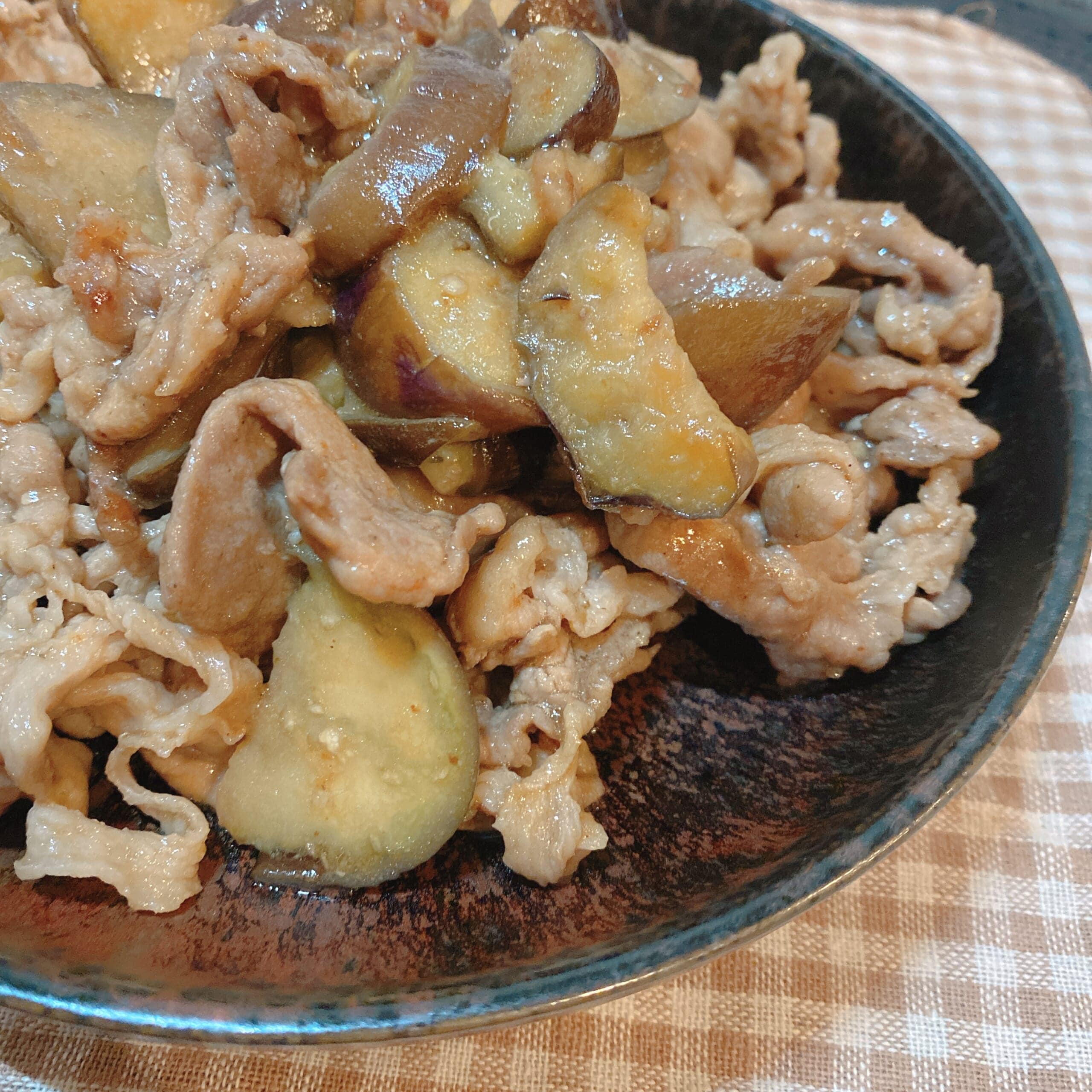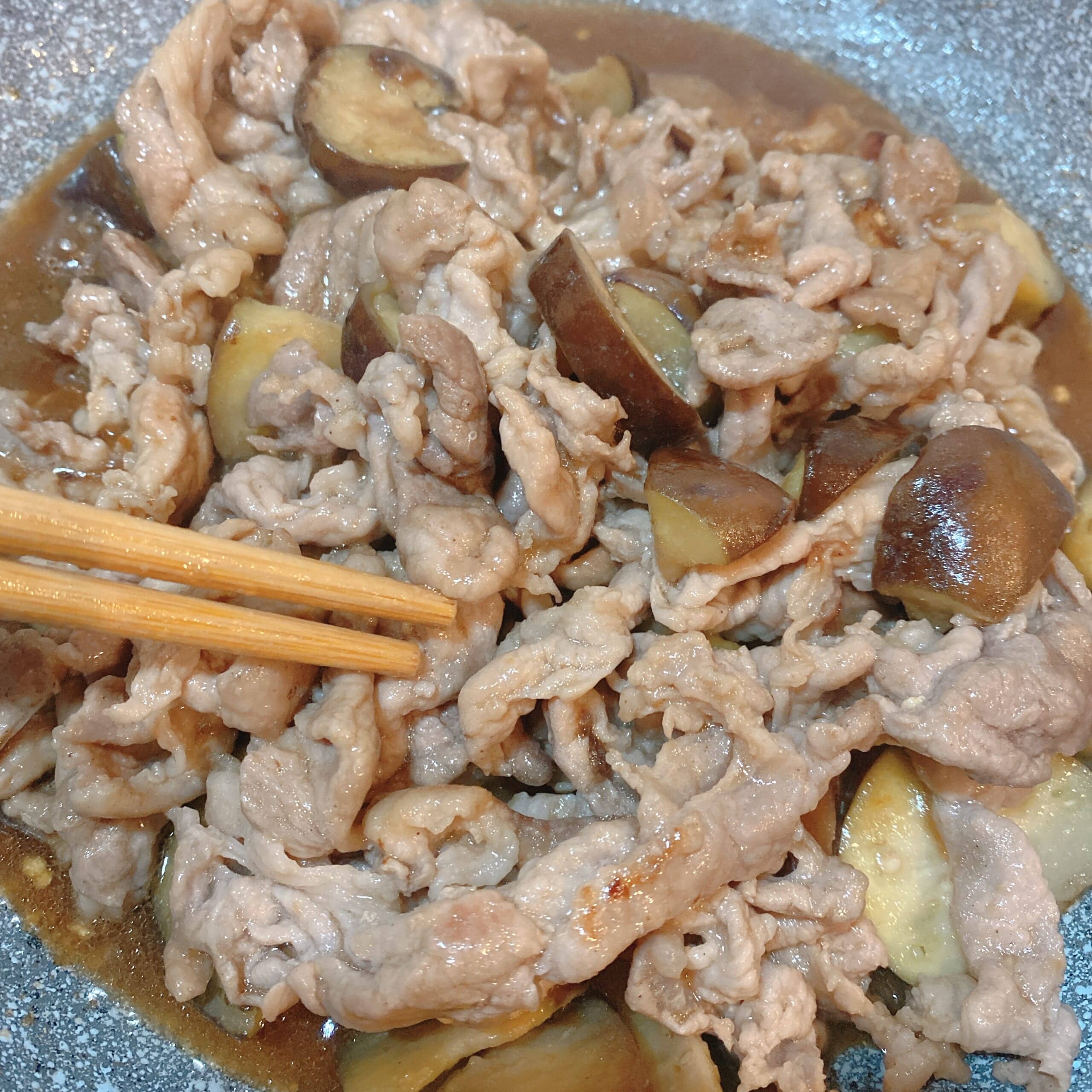 フライパンに油を熱し、下準備した豚肉と乱切りにした茄子を炒めていきます。